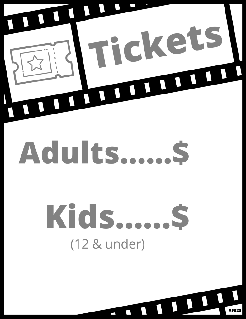 Ticket sales! How much are the tickets? Have your child if possible write the amount in. For younger kids, keep the ticket price simple- so its not overwhelming when customers pay for tickets.