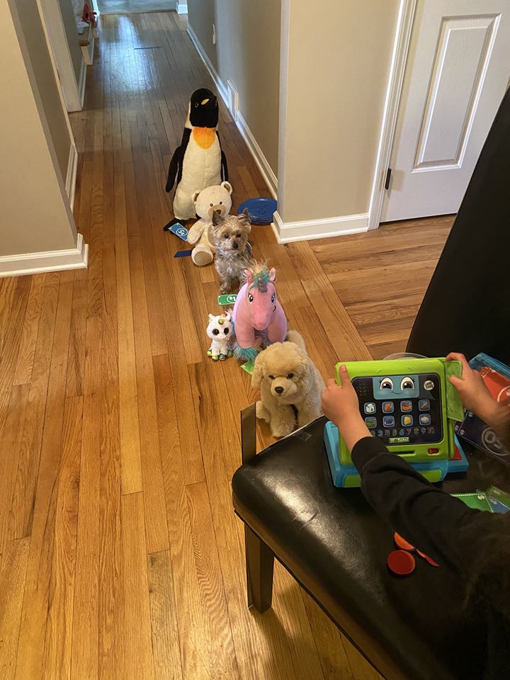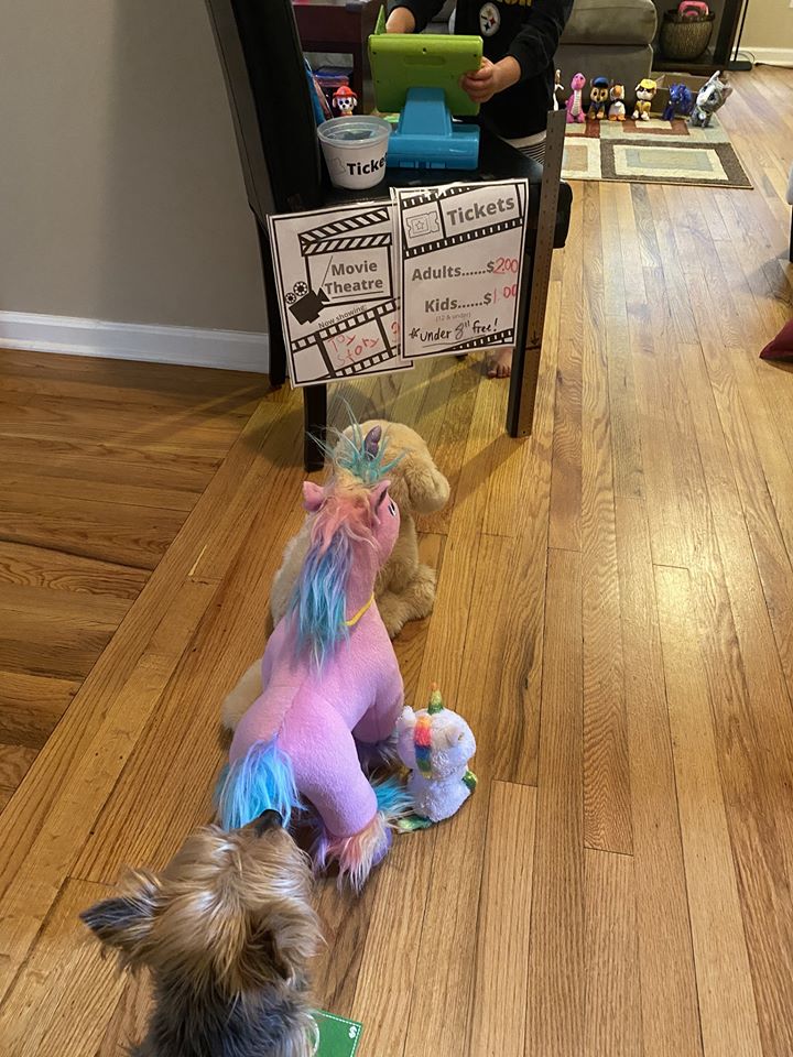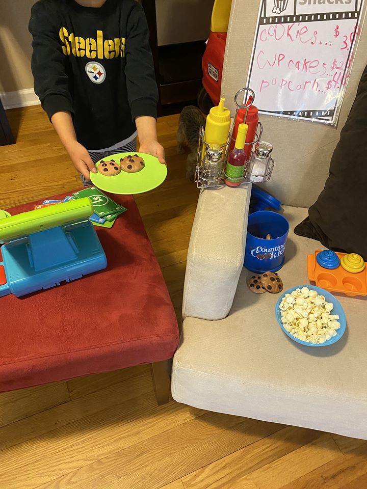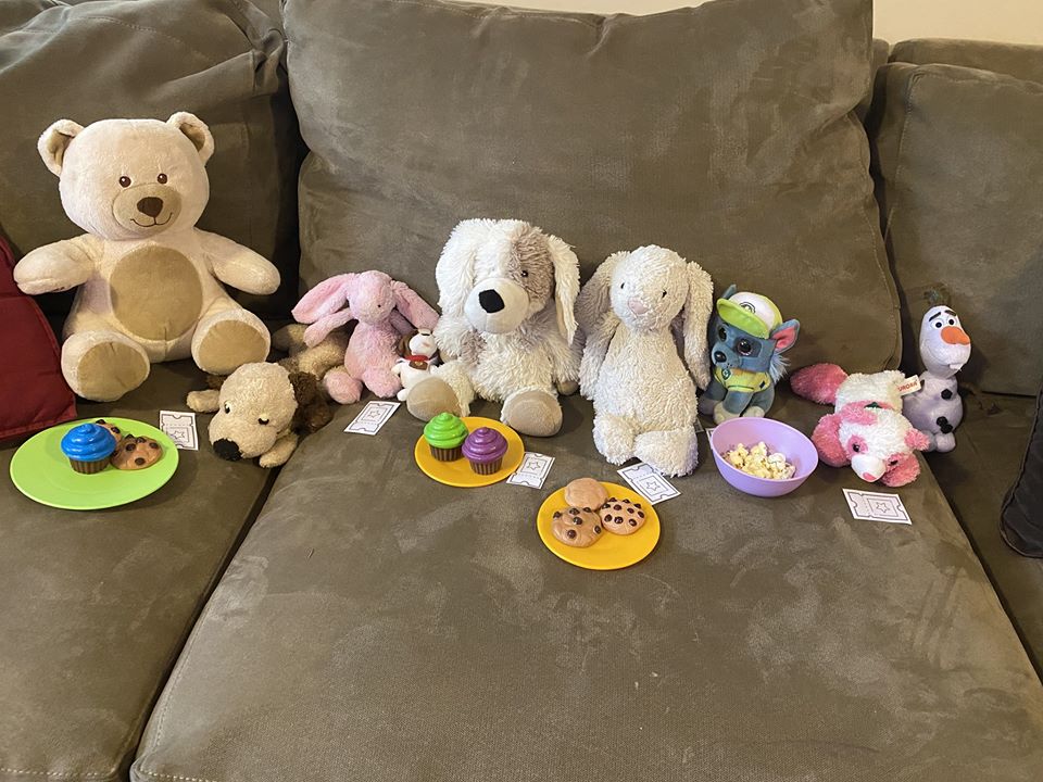 Everyone loves snacks at the movies! You can use real or pretend food. We used pretend food for the stuffed animals and real food for us and the dog. Popcorn is a must at the movies!