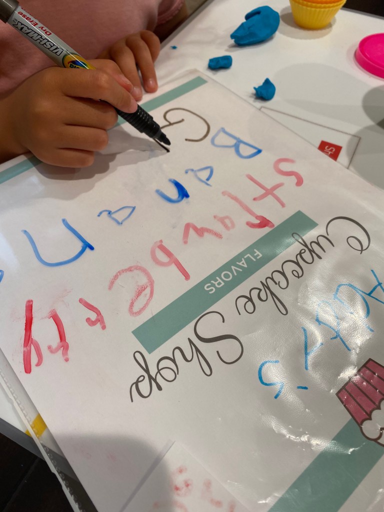 We started by talking about what a baker/pastry chef is and then we got to work as one. She put her name on her chef hat (see template below) and named her cupcake shop (see printable below). Then the creating began (see materials). Everything we used was already in our house- didn’t buy anything. Get creative with supplies already in your house. After we made each flavor of cupcake, we listed it on the cupcake flavor sheet. We also made a name card for each flavor too.