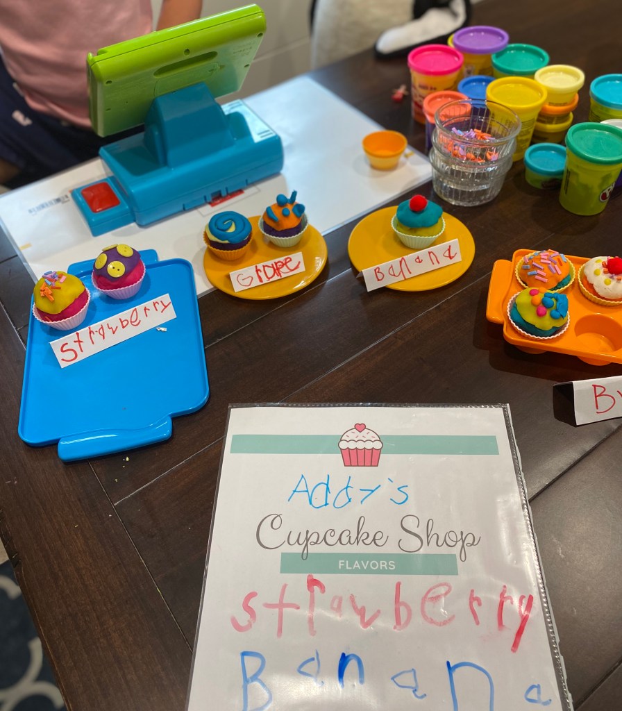 Once all of the “baking” was done, it was time to open the Cupcake Shop. It was a pretty busy day, we sold out quickly. All of the adults in our house supported the shop and then the stuffed animals went too.