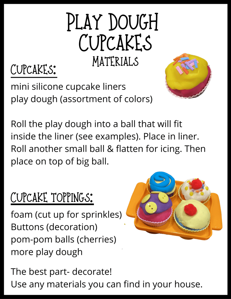 You can also make your own play dough for this activity. Have your child pick out the flavors and icing colors before making. We didn’t have any brown play dough (for chocolate), next time we’ll make it and incorporate a lesson on color mixing to make brown.