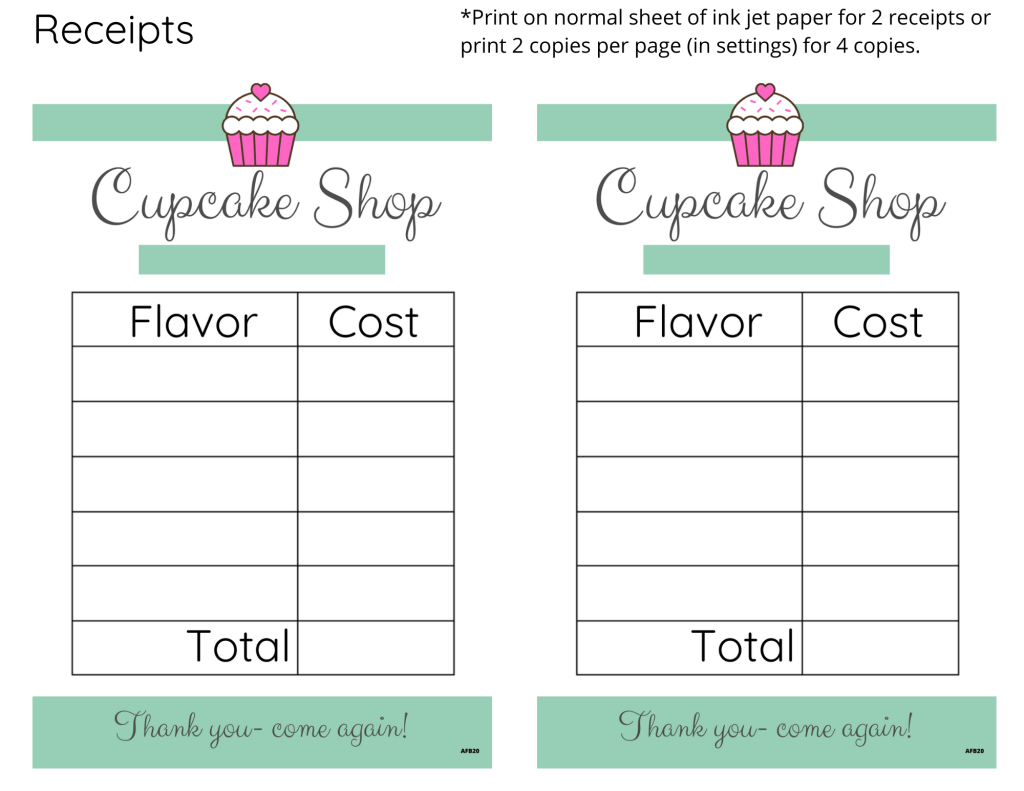In this part of the activity, you could also incorporate money. We are working on coin identification, so our cupcakes were 25 cents each. You could also put the cost of each cupcake next to the flavors on the flavor handout and create receipts (see below). Great way to sneak in math, writing, & reading practice, while having fun.