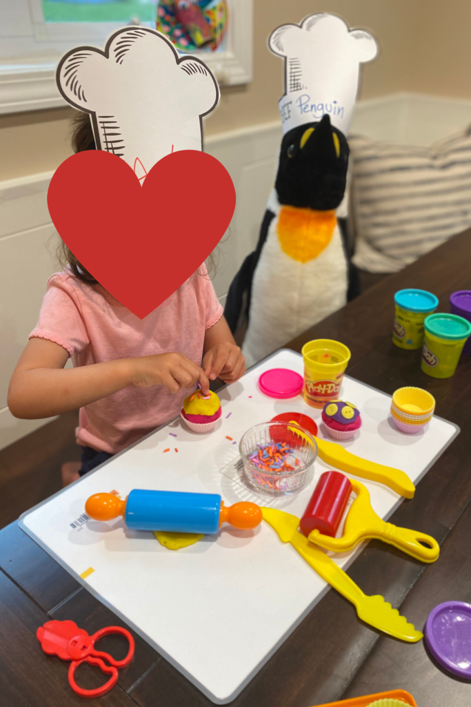 We also used a few props we already had- cash register, play plates, & cupcake pan. Not necessary. More props the better though. Search your child’s play kitchen stash.