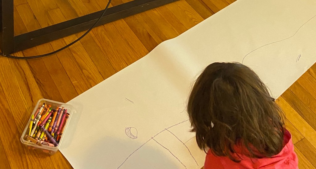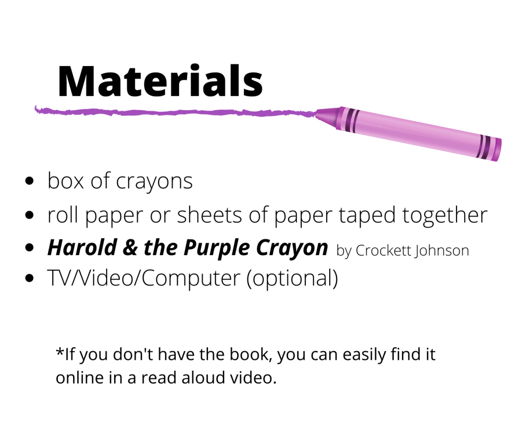 This was one of my favorite lessons when teaching & my daughter enjoyed it too. We started out by reading the book Harold and the Purple Crayon by Crockett Johnson. After we read the book, we discussed how she could be just like Harold and go on a drawing adventure. Have your child choose a color of crayon to go on the adventure with. Of course my daughter chose purple too, because it’s one of her favorite colors. Your child will make one big consecutive drawing. We used a white roll paper for the activity.
