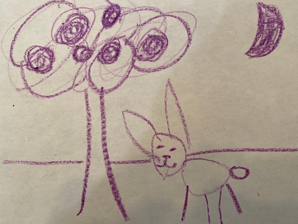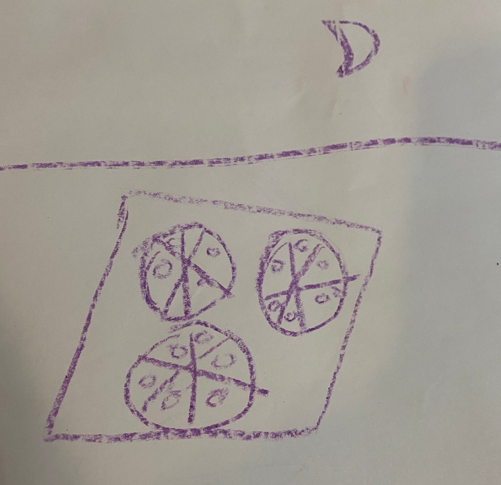 In the book, Harold draws an apple tree and then a dragon to protect it. My daughter chose to draw an apple tree as well, but then chose a different creature to protect her tree- a bunny. The moon follows Harold throughout the book, so she drew the moon in all of her pictures. Another example is Harold made a picnic of pies. My daughter liked the picnic idea, but with pizza instead (see picture below).