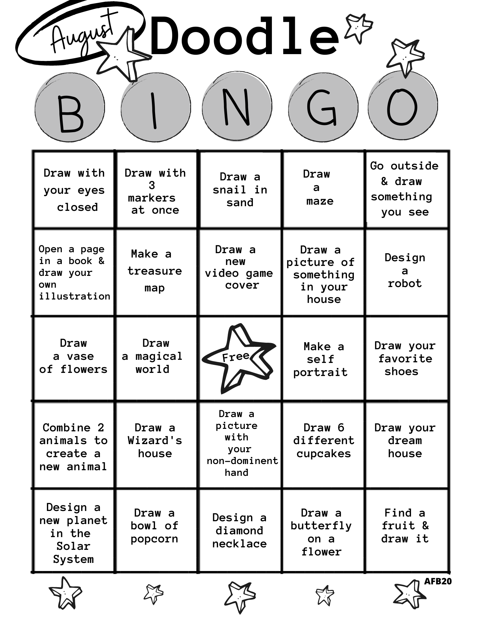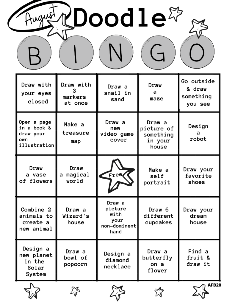 Every week in August complete 4 or 5 drawings in a row & get BINGO!