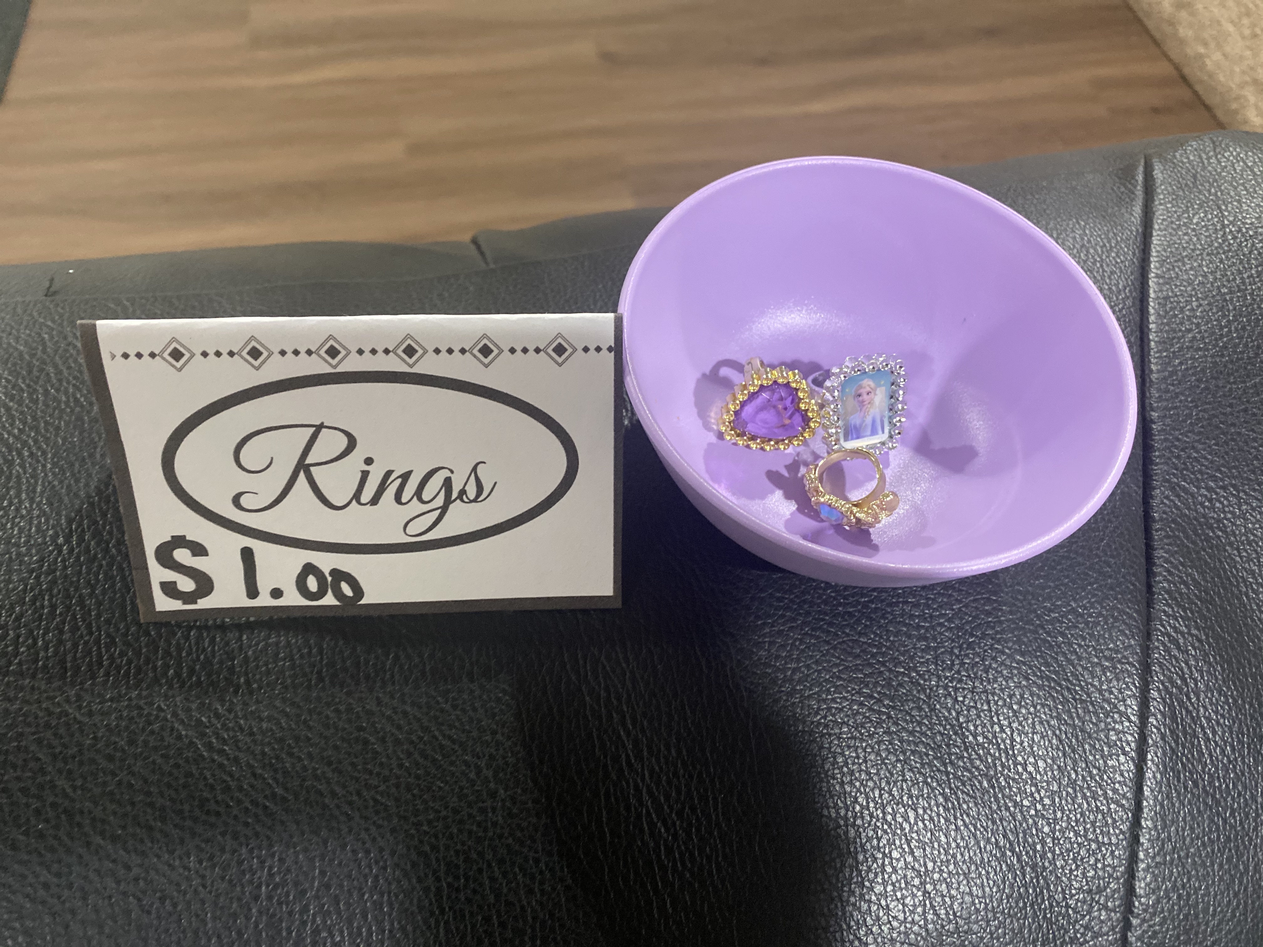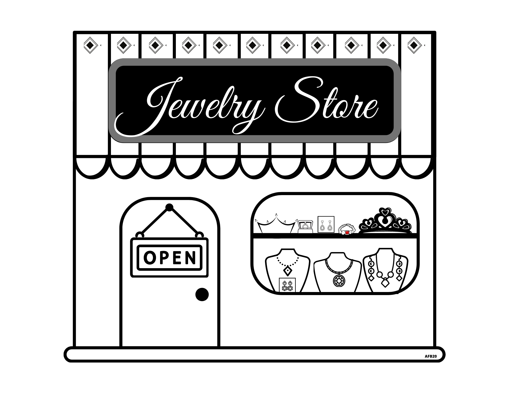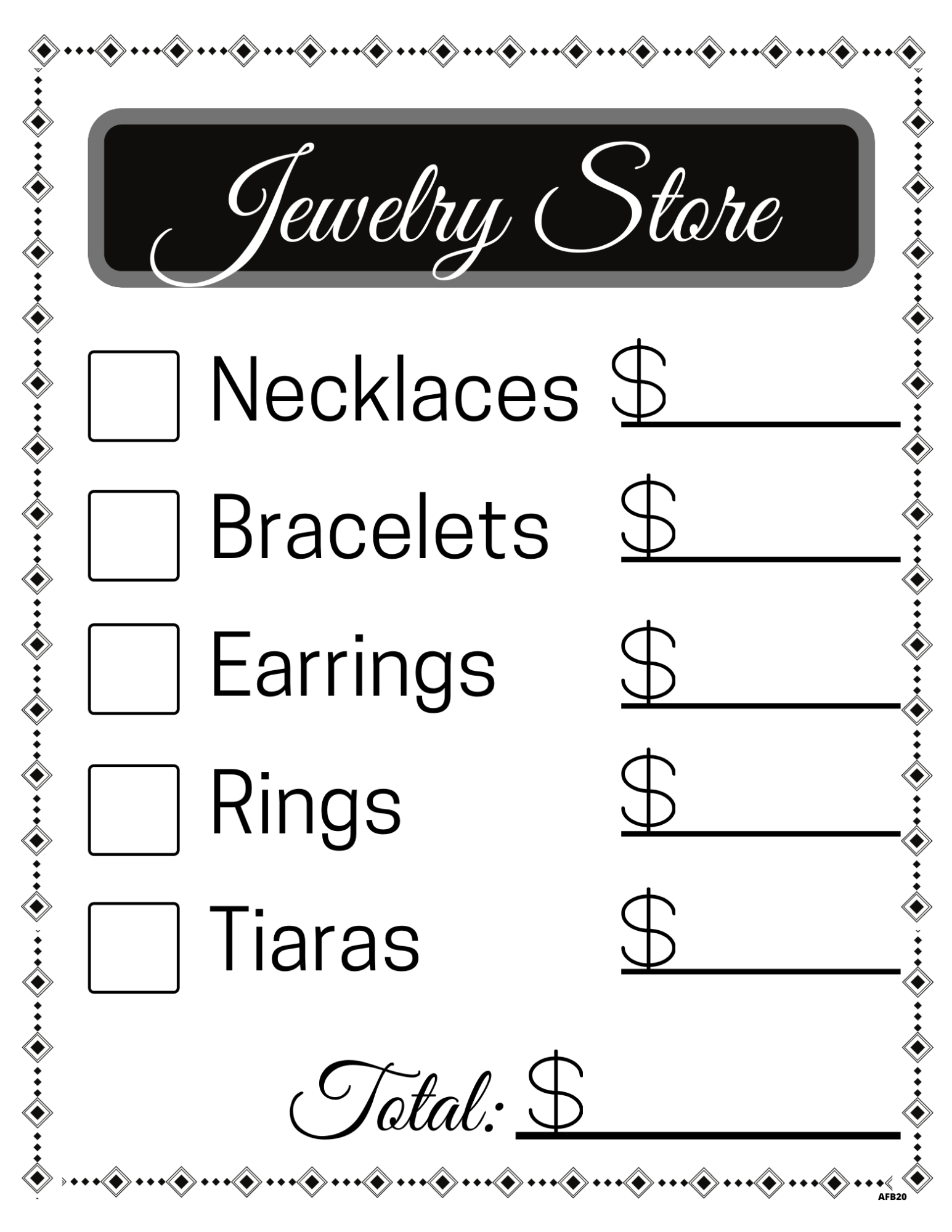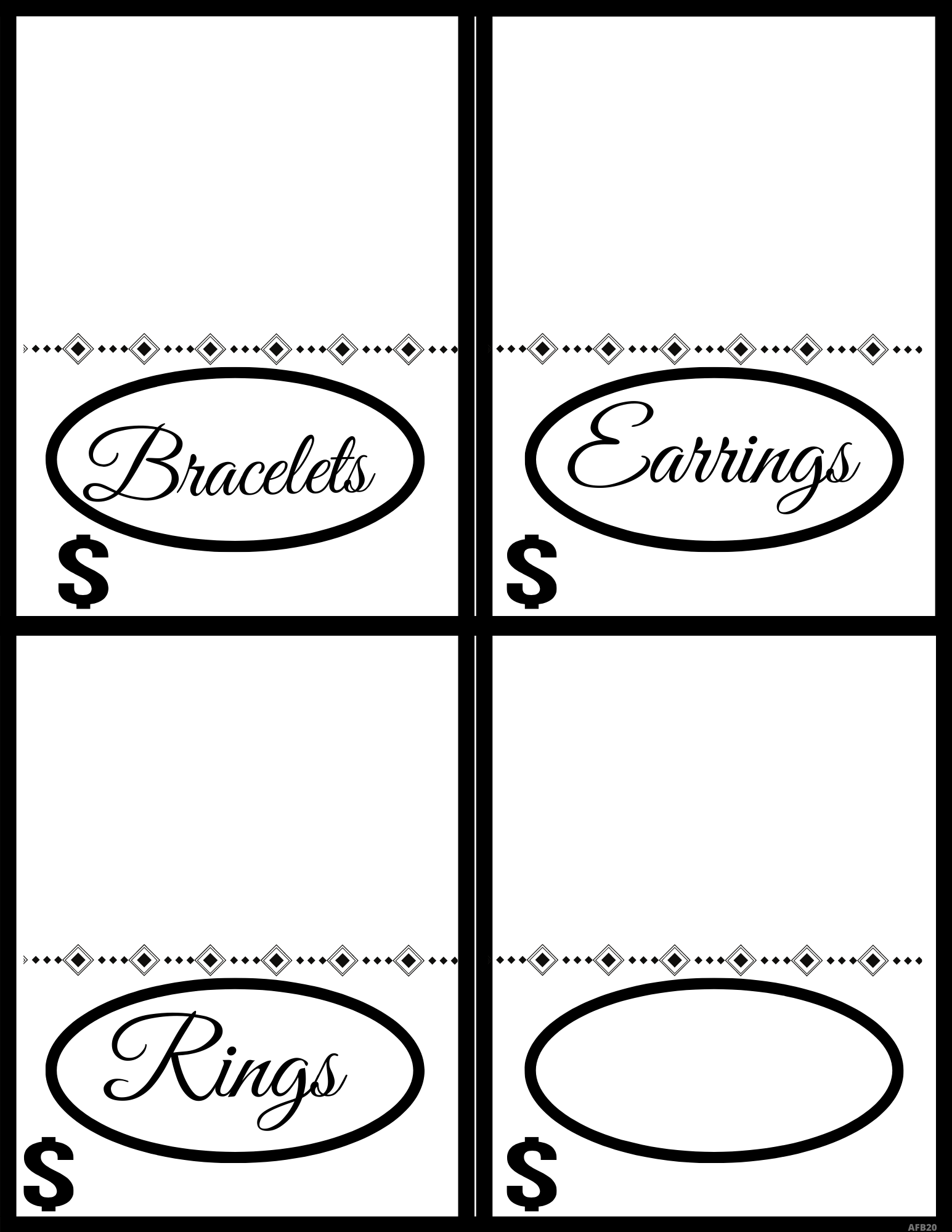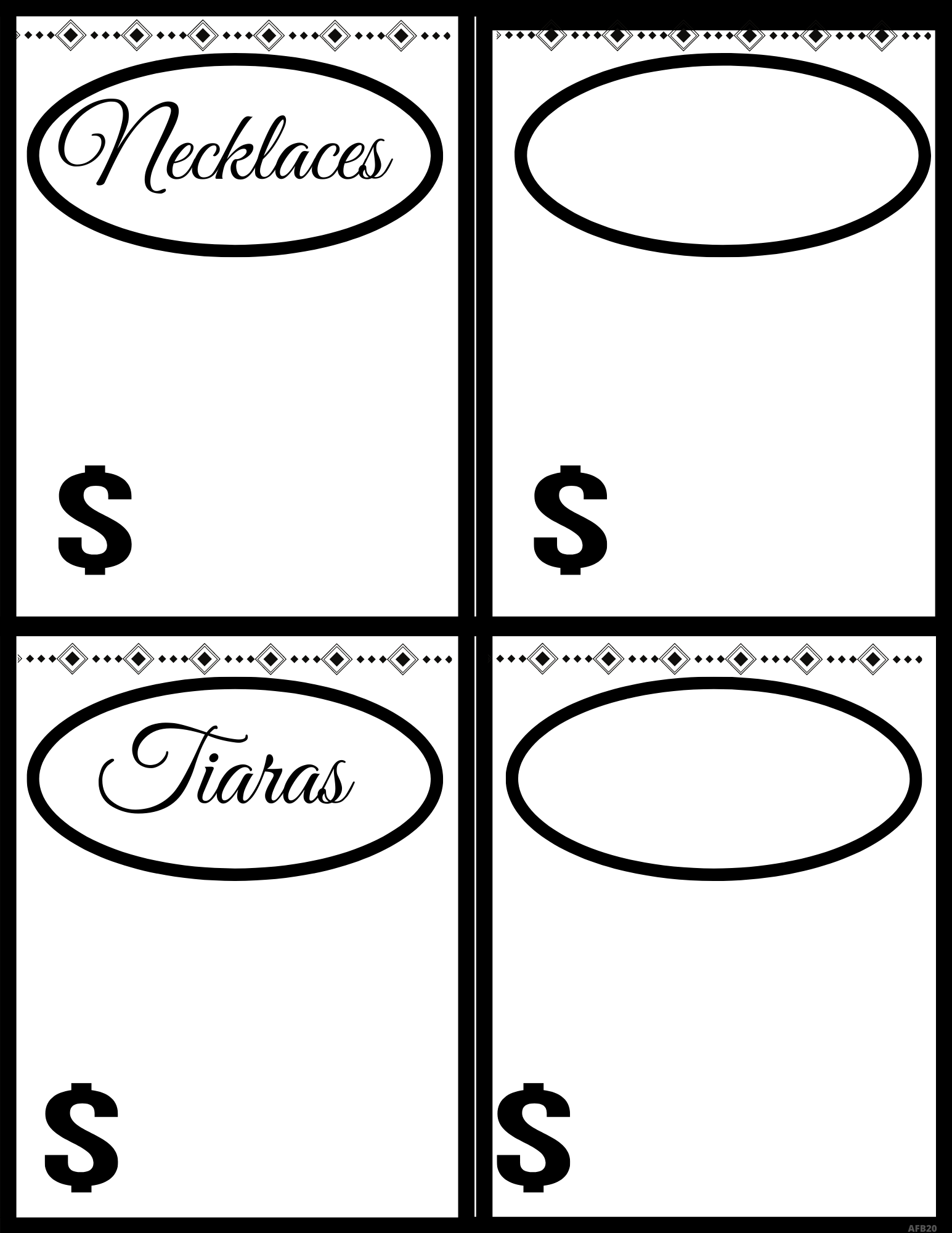 To start we gathered all of the play jewelry we could find in the house. Then we decided what signs we needed. There are blank signs, so you have other options for items besides the ones we used.