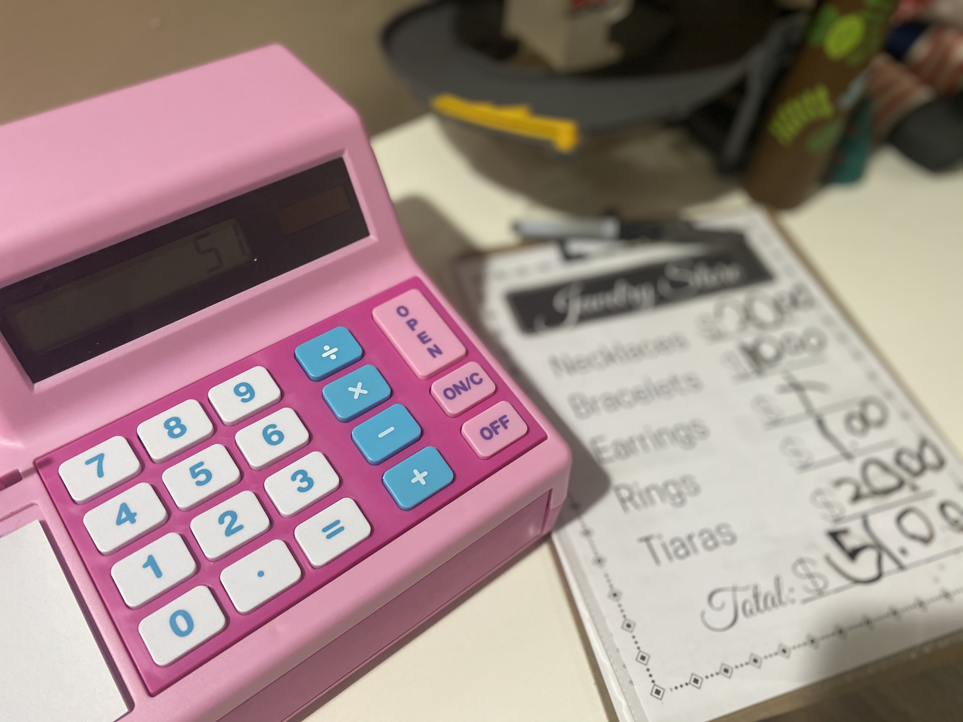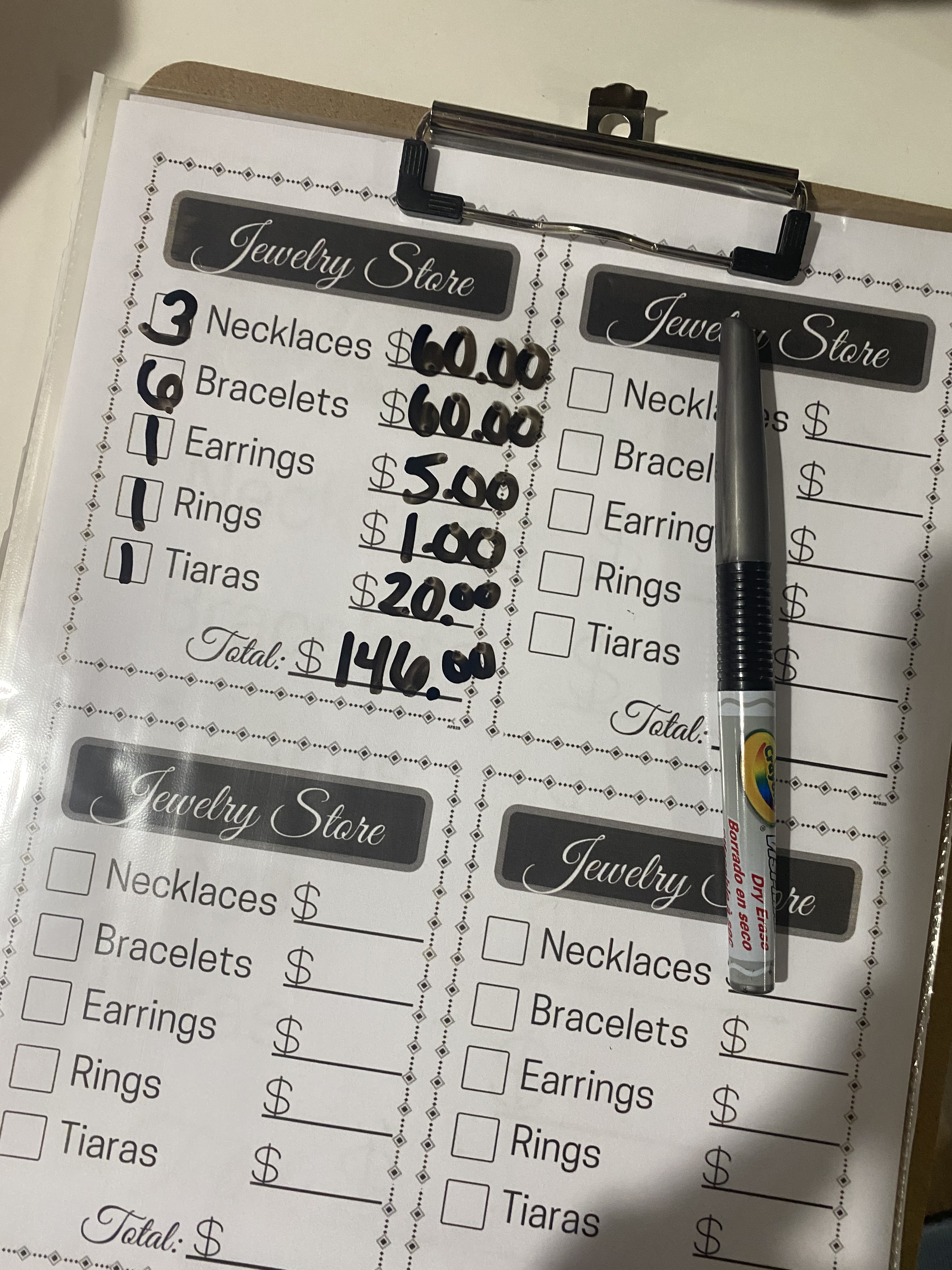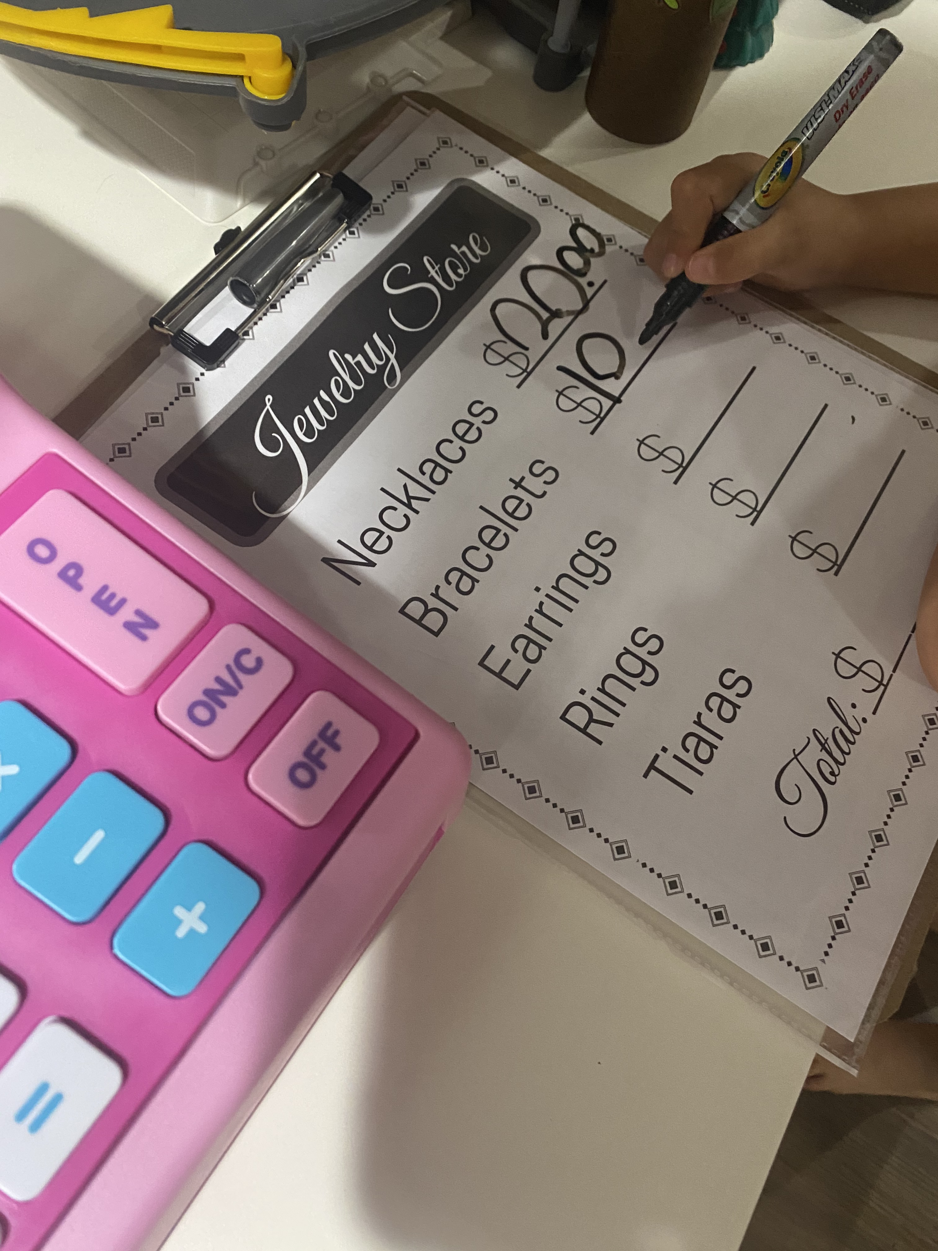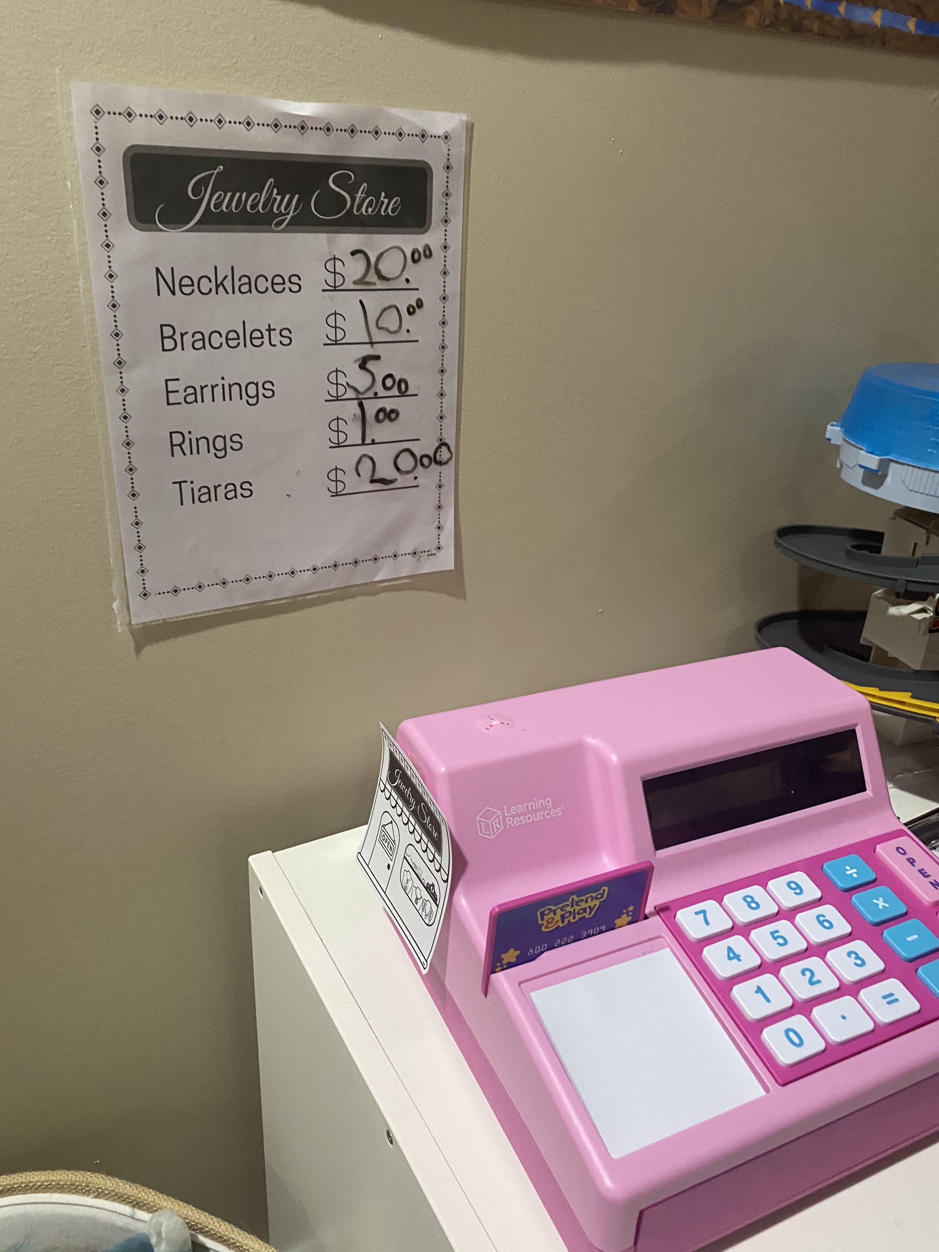 After all of the jewelry was set up. We printed all of the signs out and decided how much each item should cost. You can make it as simple as you want or hard. The numbers we chose are the dollar bills that came with our cash register. You could focus on dollars only or cents only or dollars and cents- depending on age/skill level. Our goal today was different dollar bill identification and simple math with calculator (cash register).