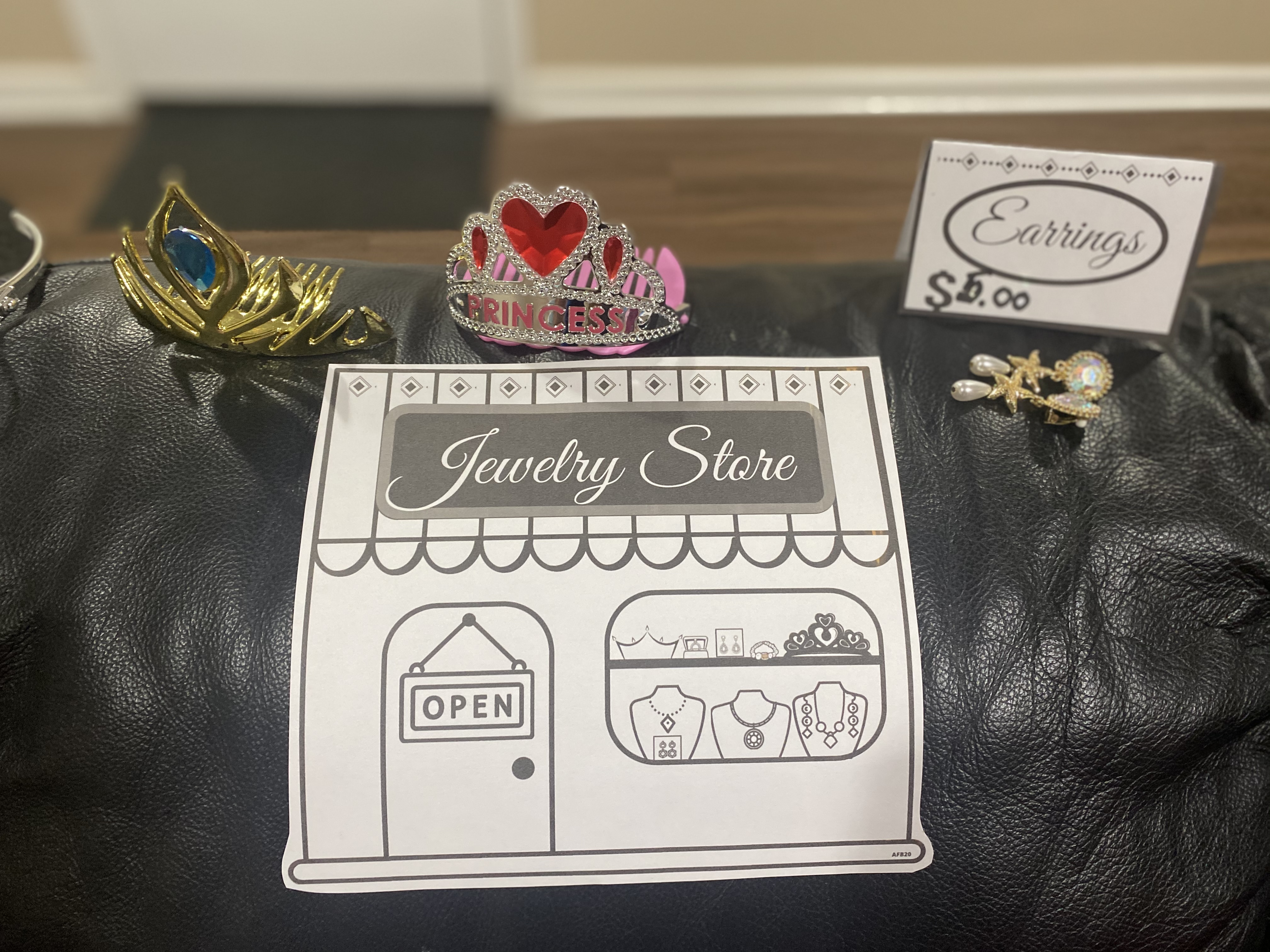 Rainy days or cold days outside are the perfect days for pretend play! Today we created a Jewelry Store on our basement couch. It was simple, fun, and of course educational! Reviews letter and number identification, math (addition, dollar/cent recognition), practice writing, how a business works.
