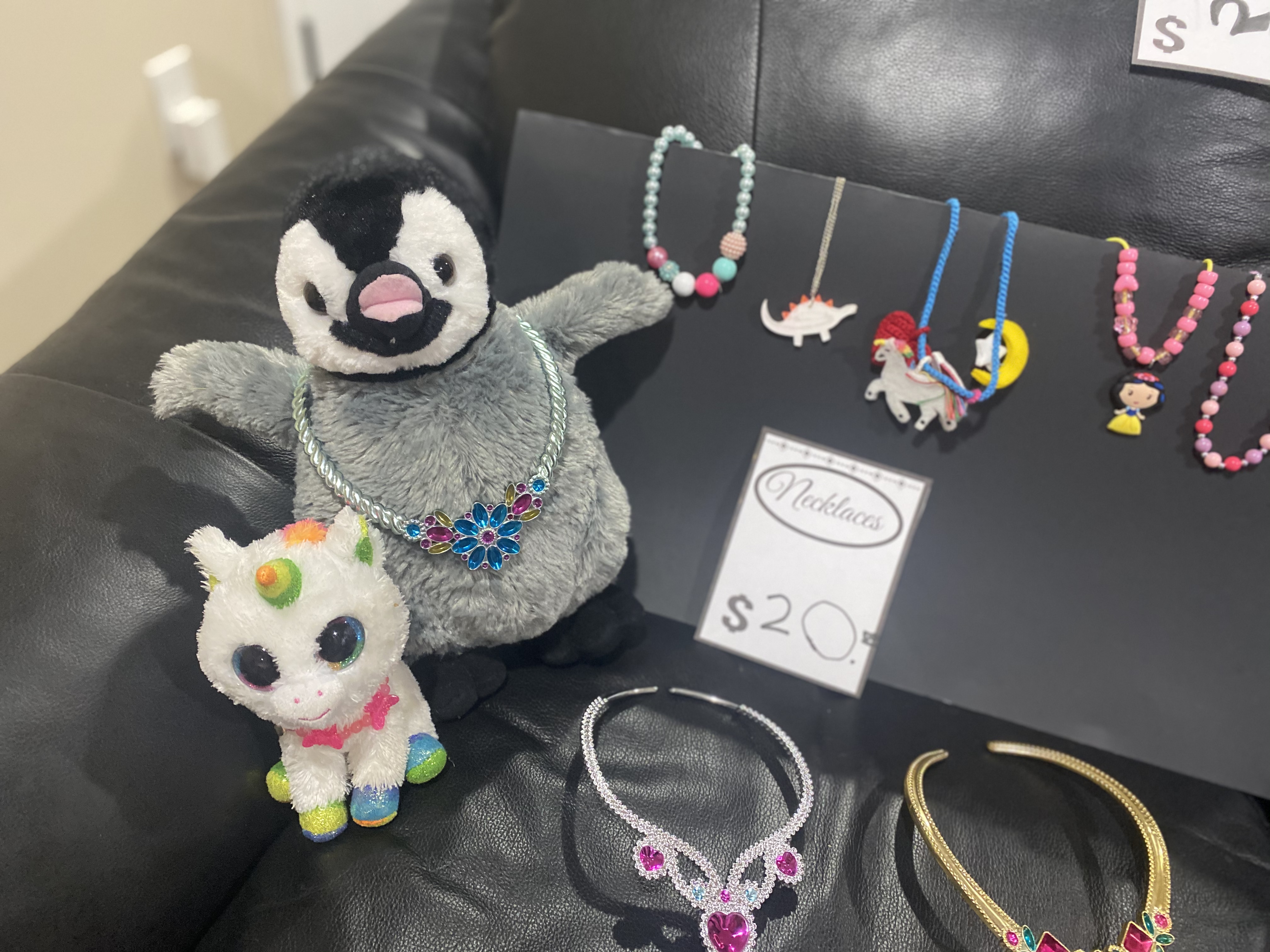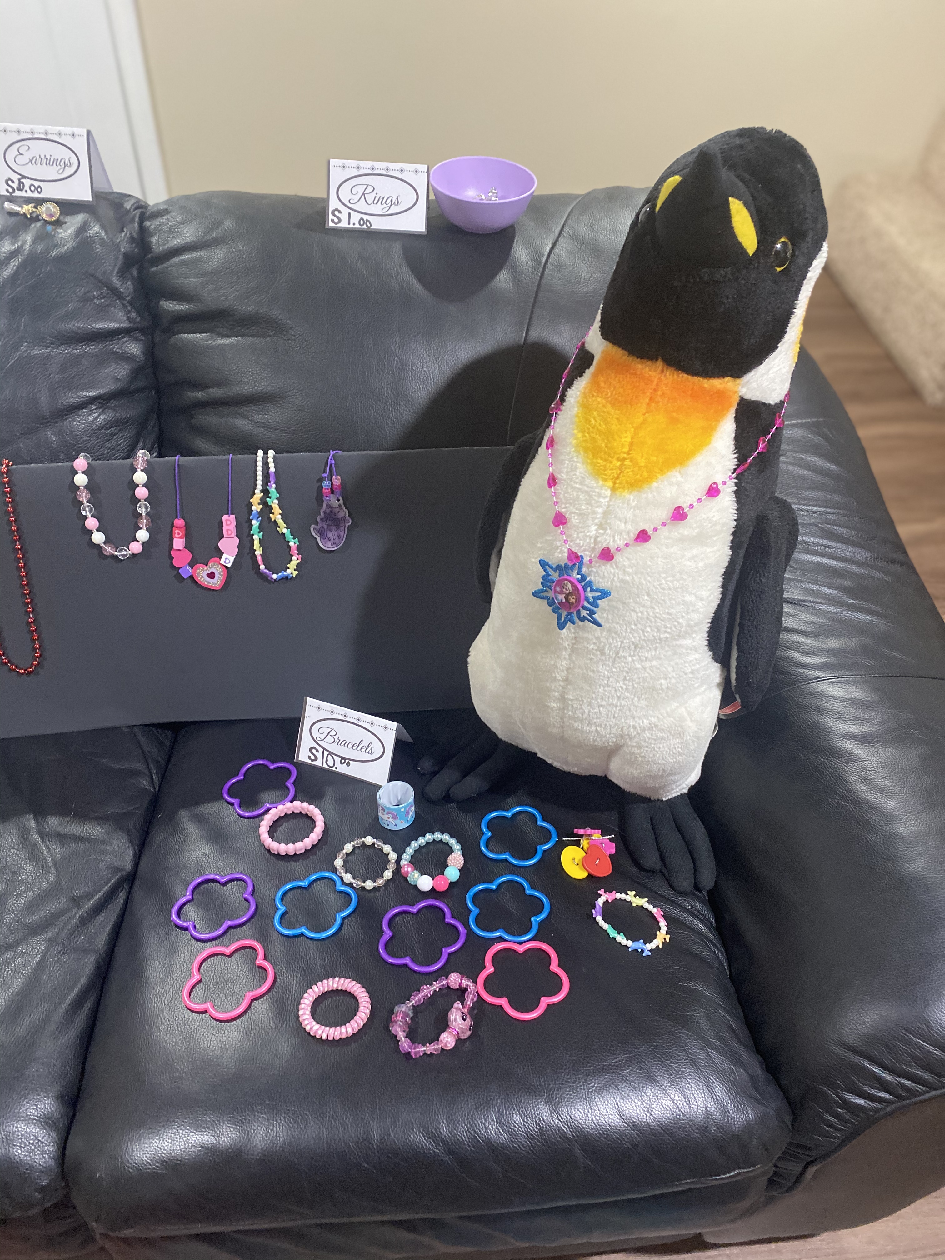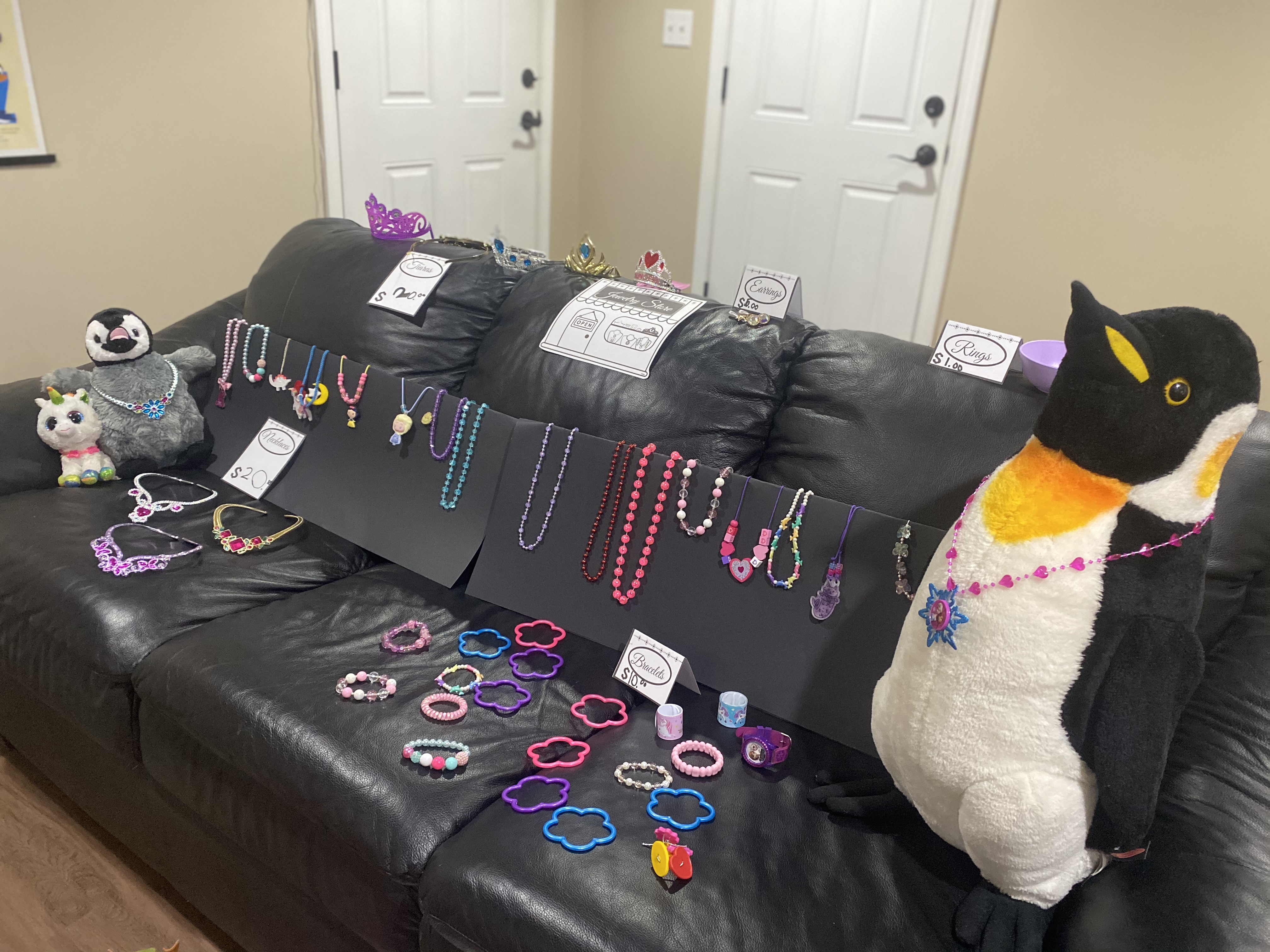 How to display all of the jewelry? The couch seemed to be a great place to display it all. We folded poster board in half to display the necklaces on. We just placed all of the other jewelry on the couch except for the rings, which we put in a bowl. Of course, we had to add a few models in the store.