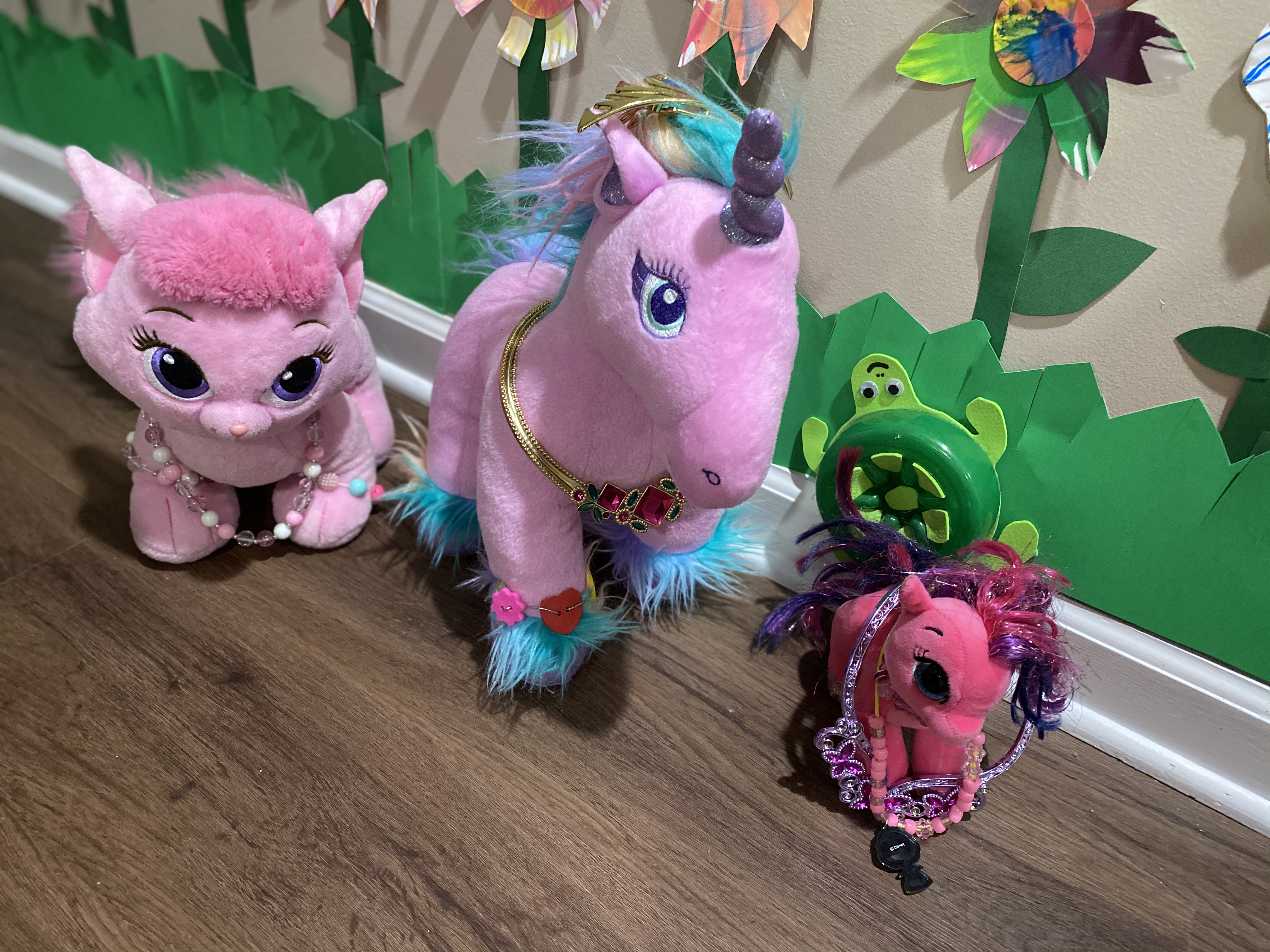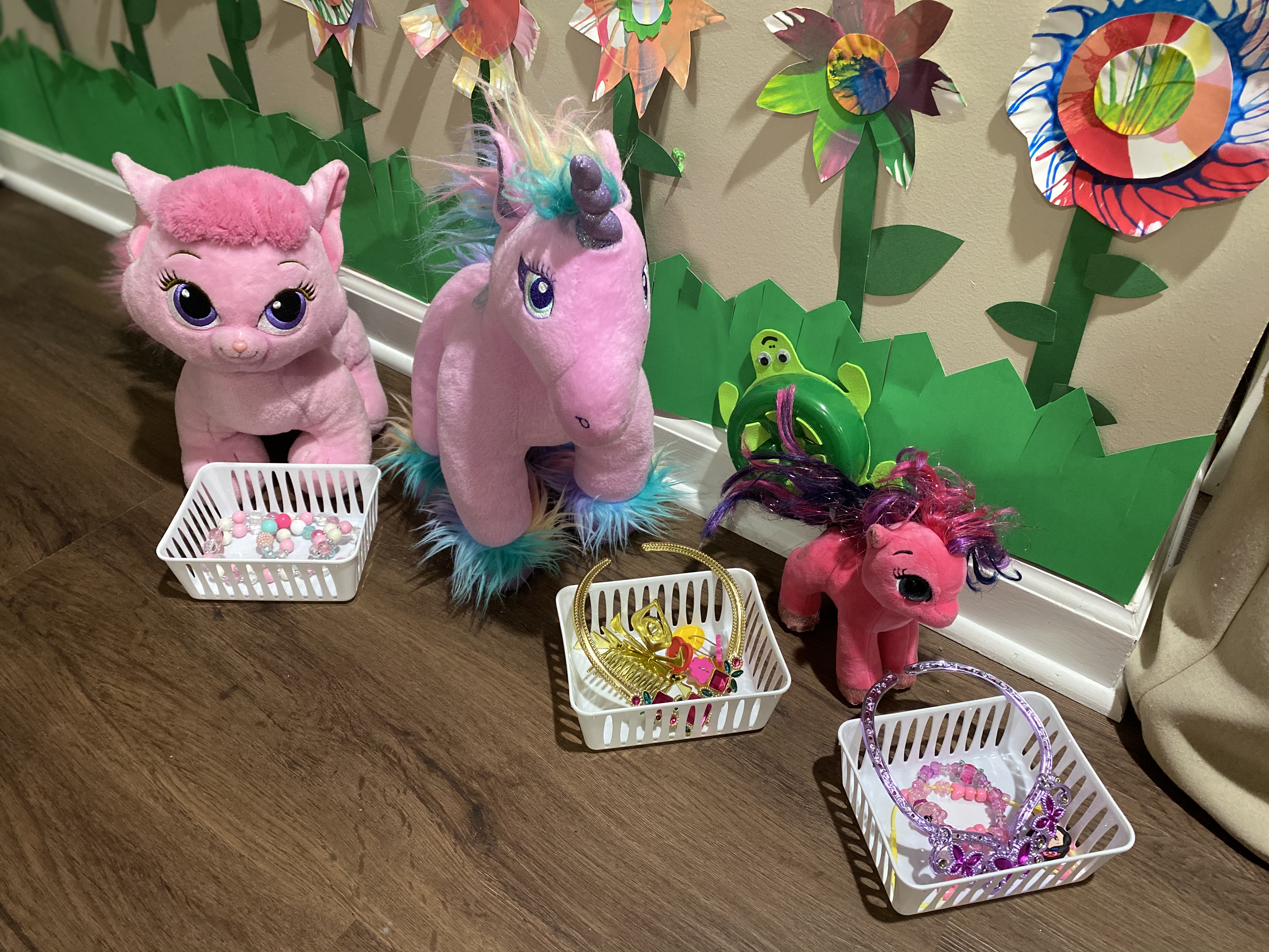 We used little white baskets for the customers in the store (bought at DollarTree). Since it was only my daughter and me, we took turns playing customer and employee and also had some studded animals as customers. This is also a great activity to do with a group of kids and they can take turns playing different roles. The best part about this activity is that it can be great for multiple ages- can be made harder or easier by cost of jewelry.