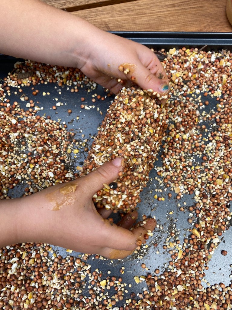 Spread the peanut butter all over the paper tube. Once done, roll the paper tube through the bird seed. Once done, if any empty areas, recover that area with peanut butter and roll again in the bird seed. Then slip the twine or yard through the tube and tie a knot at the top. Clean up is easy- throw away plate & knife. Save the extra bird feed for another future activity.