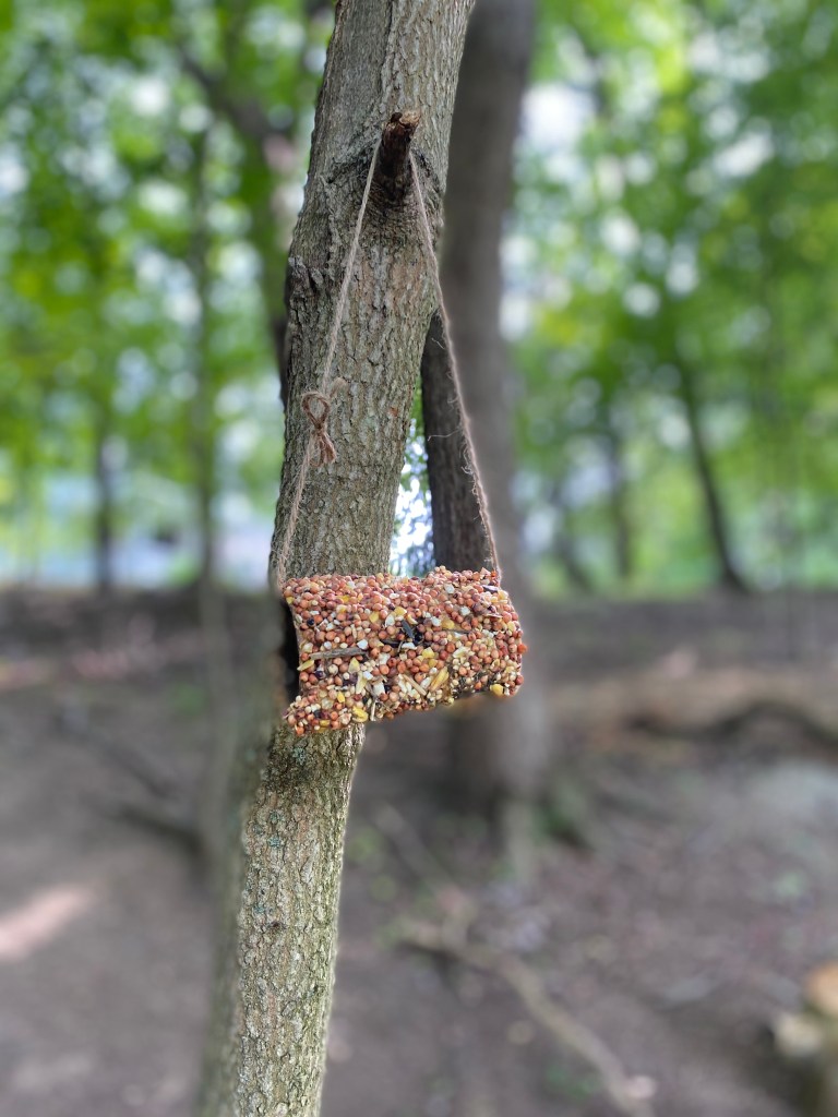Now go exploring on a nature hike! Where do birds like to go? Where do you often see birds? Hang your bird feeder when you find the perfect spot. If spring/fall/ winter (too cold out), try to place your bird feeder close to a window, so your child can look out the window and see the birds enjoying their creation.