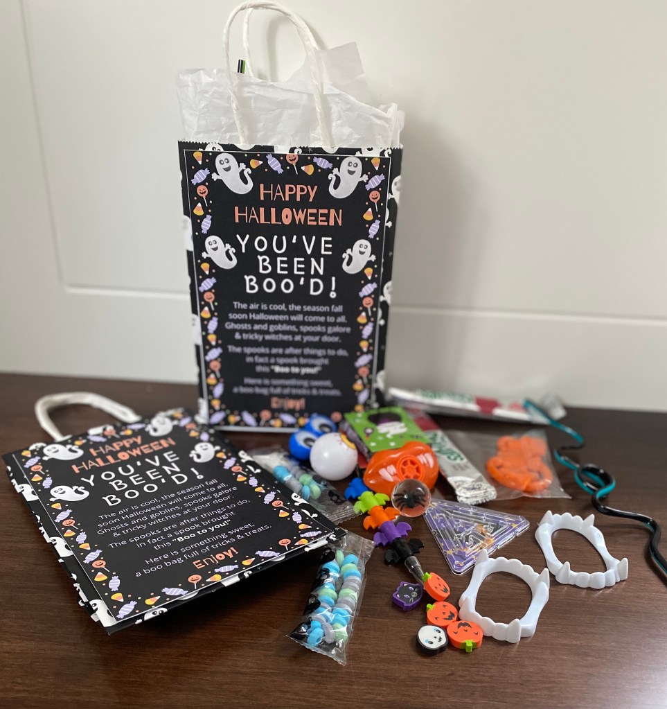 Happy Halloween! No way better to celebrate than by surprising your friends and family with a “Boo Bag“. Boo Bags are a fill-your-own kit to surprise friends and family with Halloween treats as an alternative to traditional trick-or-treating during the pandemic.