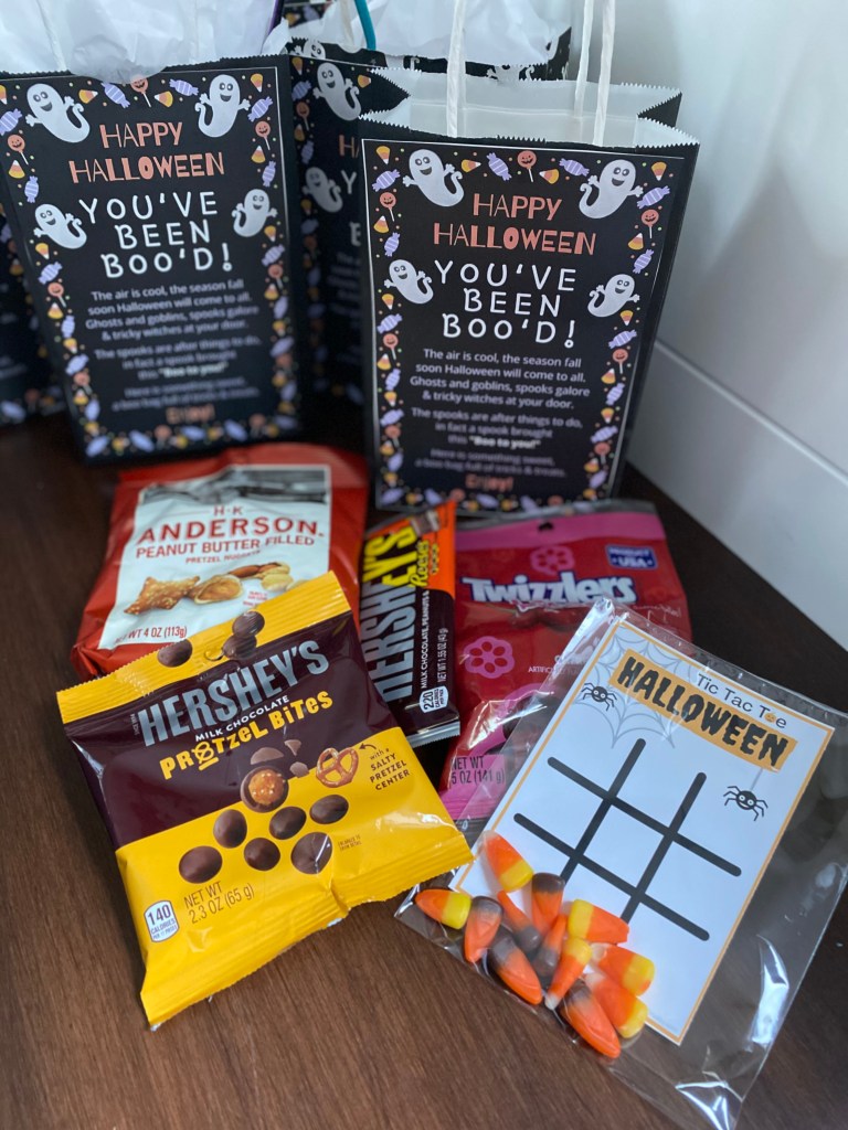 Boo bags can be for any ages- not just families with kids. Fill with yummy snacks for adults!