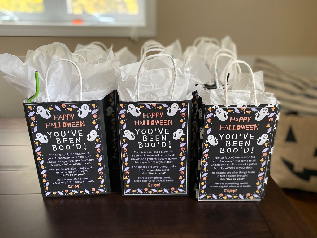 The traditional Boo Bags come with a sign that say you’ve “been boo-ed”, then the recipient places the sign in their window. That family then is expected to “boo” two more families by creating their own boo bags.