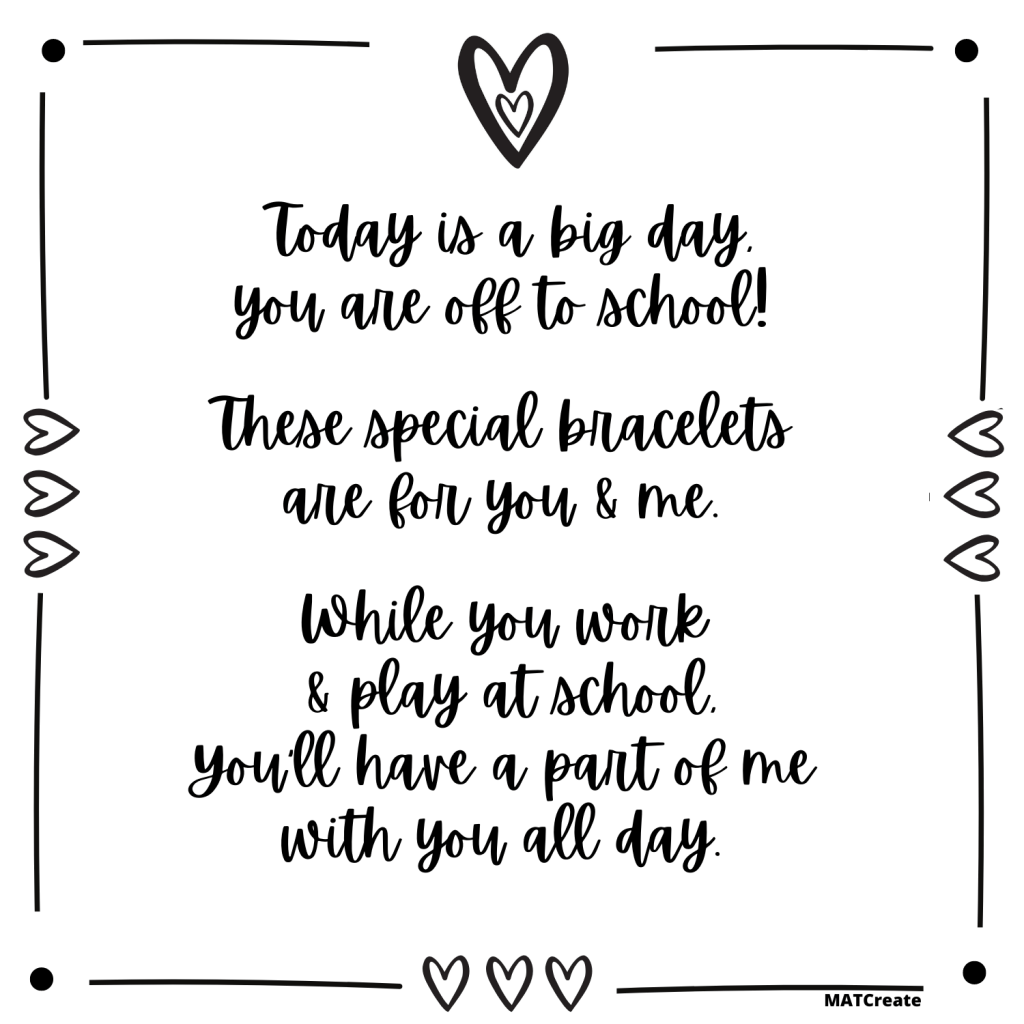 The night before school I laid the note (see below) and the bracelets out on the kitchen island where she eats breakfast. This way I was sure she would find them. She loved her special bracelet surprise & that I had one to match too. Except she didn’t like that the bracelet wouldn’t answer her questions like I normally would. She pointed that out to me on the car ride to school. I explained to her that she’ll have to wait until after school for that. The bracelet is magical, but not that magical. 🙂