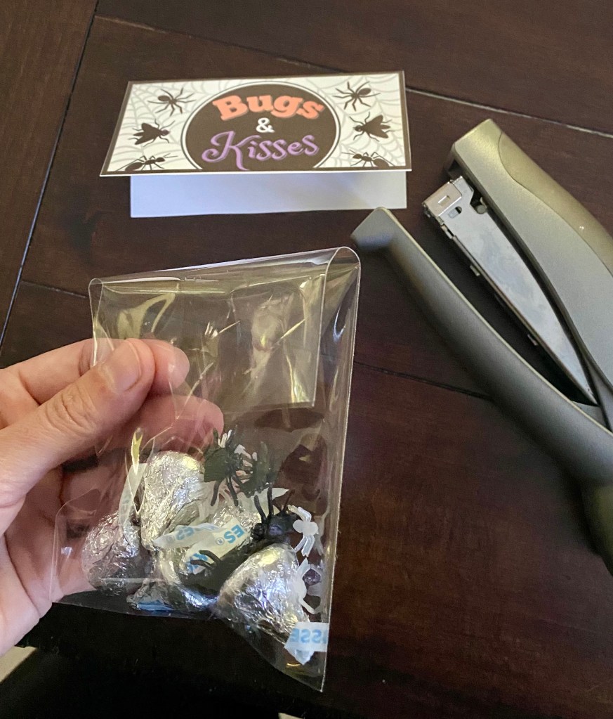 4.) Fill the bags with plastic bugs and Kisses (chocolate Hershey Kisses).