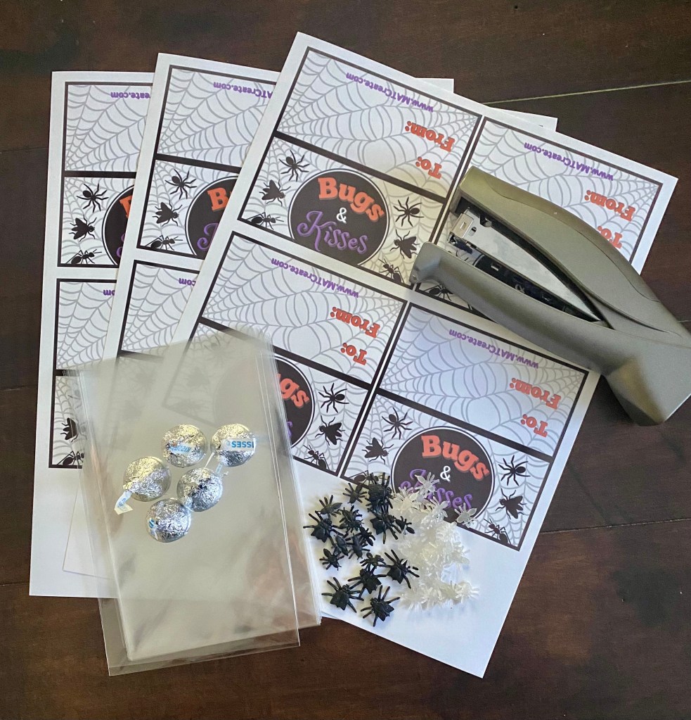 Notes: This is a great activity to have your kids help with. Review math by having them count out the number of Hershey Kisses and bugs for each bag. Let them decide who they are for and then gift give! By doing this, shows the importance of giving too, and not always receiving.
