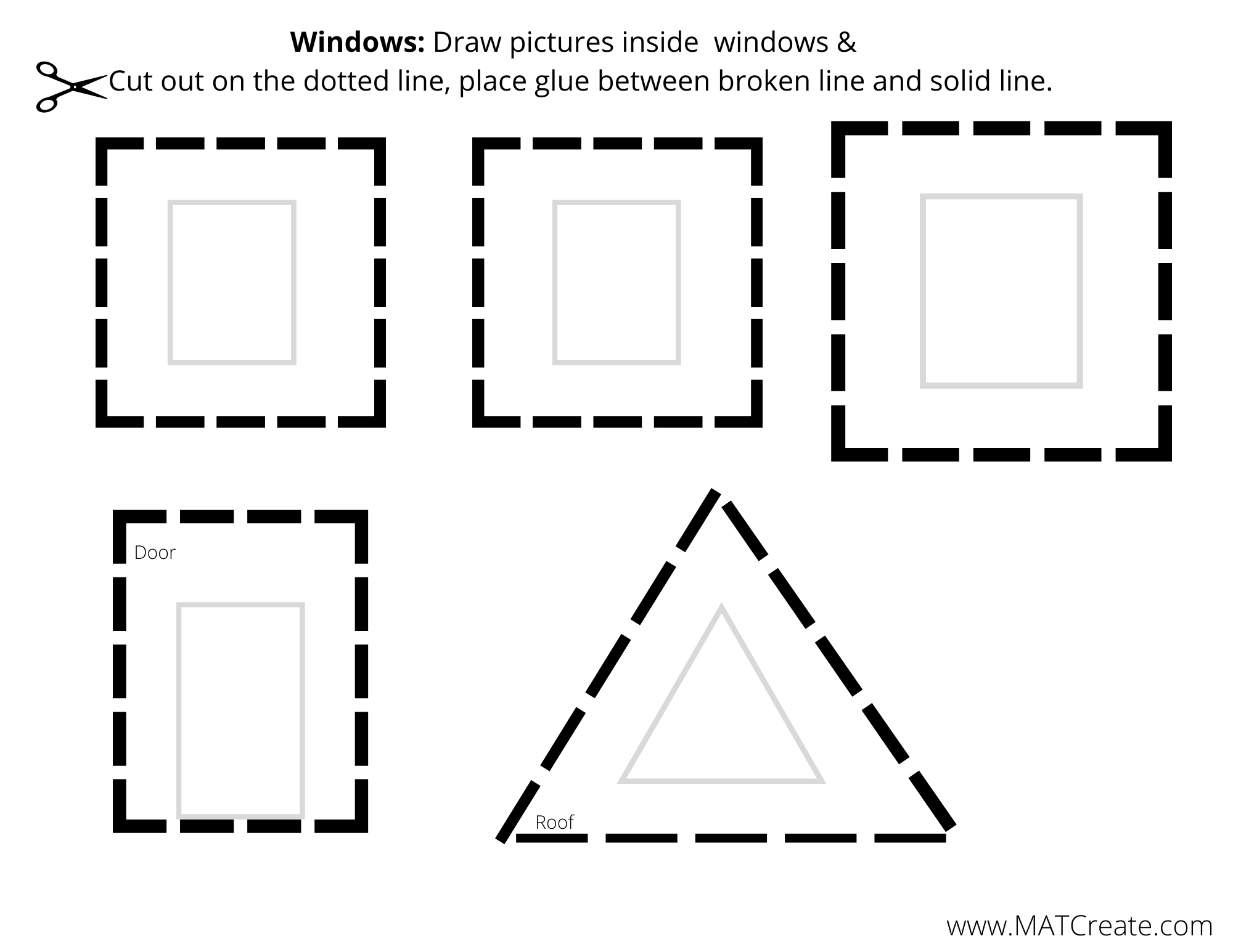 4.) Cut! Have an adult, using an x-acto knife cut on the dotted lines that surround the windows and door.