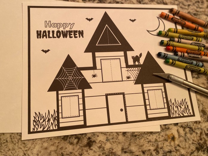 1.) Print Templates (2 total). Print out the Haunted House template and one of the inside templates (3 options). *Adult can cut if child too young.