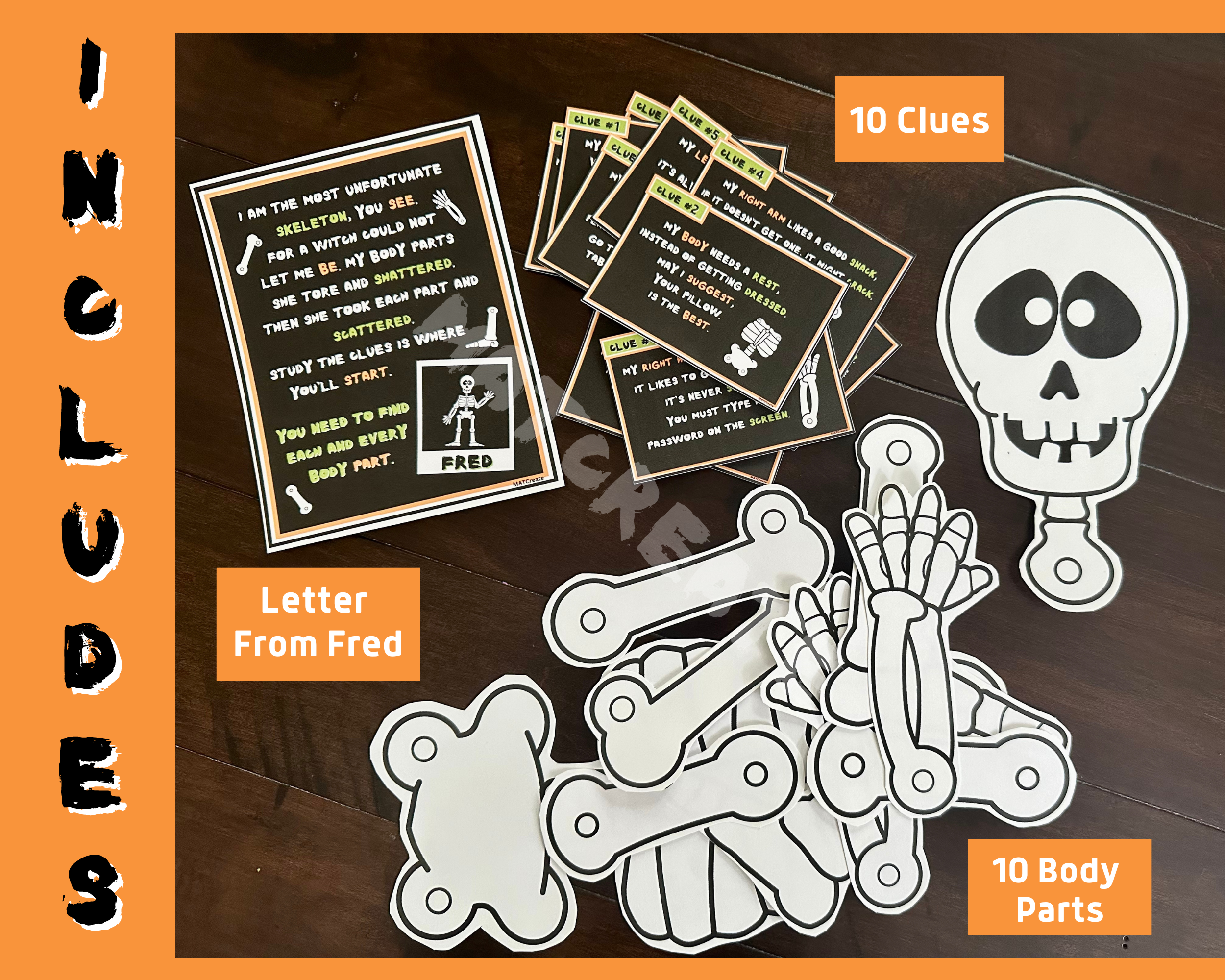Let the Halloween fun begin! Poor Fred the skeleton ran into a mean witch and she scattered him everywhere! Help Fred get himself back together by following the 10 clues to find each body part. At the end of the scavenger hunt, Fred will be complete again. Good Luck!