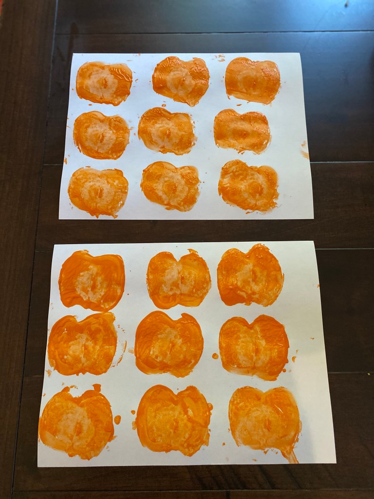 1.) Cut apple. Begin by cutting an apple in half (down the center). Spread out orange paint on a paper plate (easy clean up). Then rub the apple in the paint. Make sure entire inside of apple is covered with paint (just lift up to look). Or you can paint the apple inside with a paintbrush. Then, use the apple like a stamp. Press/stamp it onto the white cardstock. If not enough paint, add more and re-stamp the same spot. Complete several times. We did two sheets with 9 on each sheet see below). Let dry.