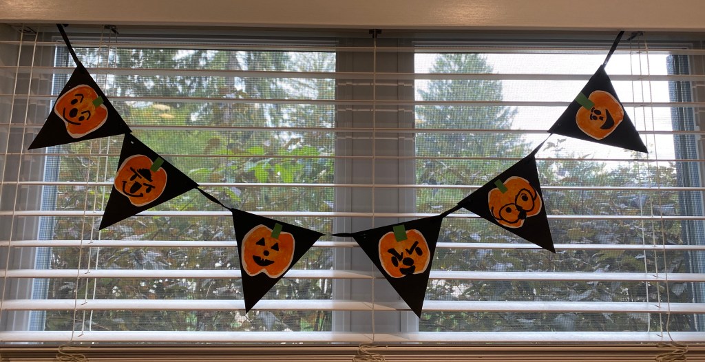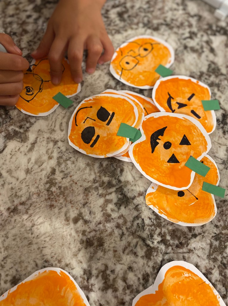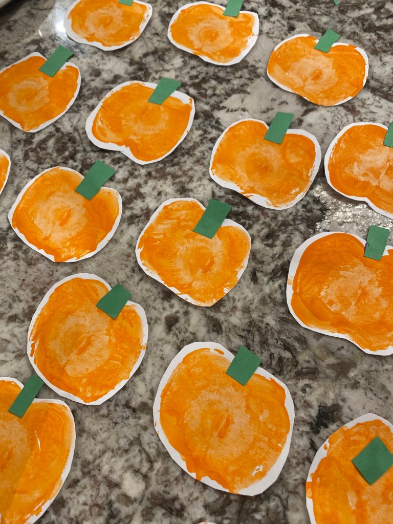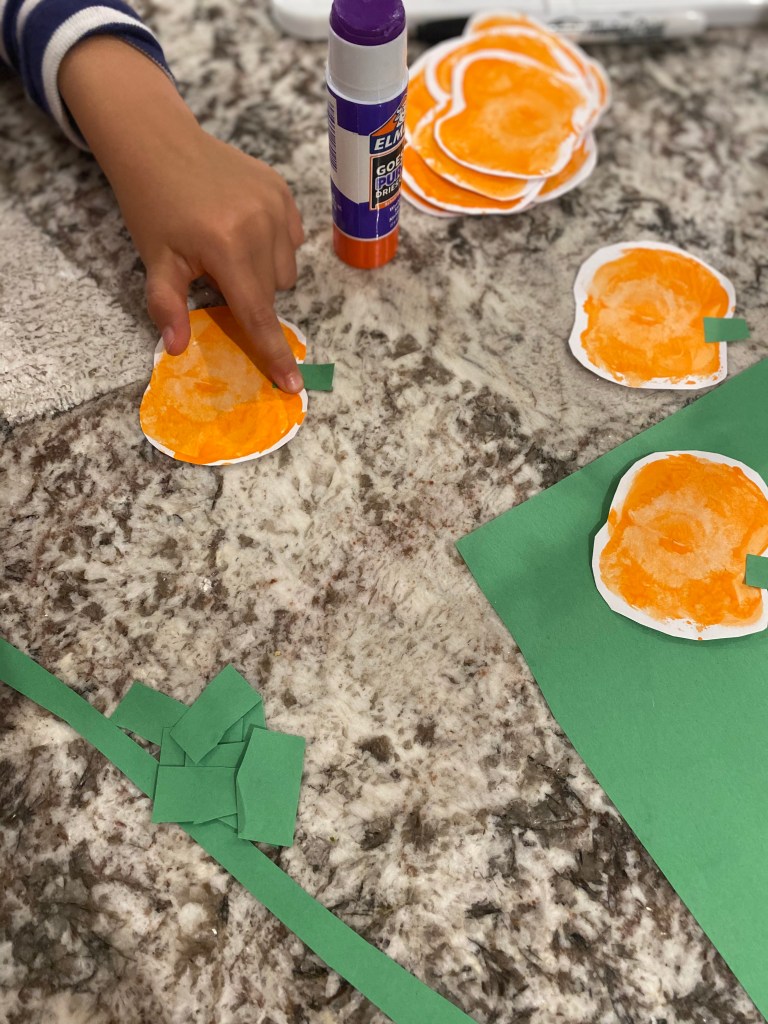 2.) Cut out! Once dry, cut out pumpkins. Either an adult can cut out or older children. Then, from a full size sheet of construction paper, cut thin strips lengthwise. Cut small rectangles then out of the strips (small kids an do this). With a glue stick or glue, place one stem on each pumpkin (see below).