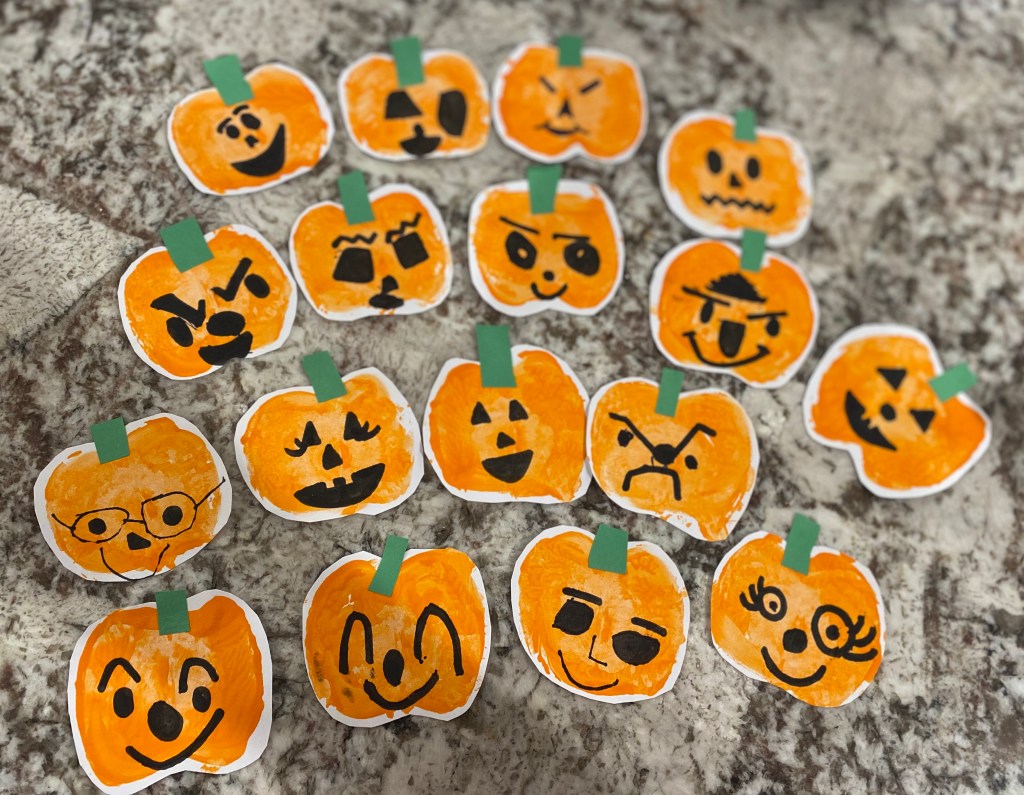 3.) Add faces! Create Jack-O-Lanterns out of the pumpkins by adding faces. Use a black marker to draw on the faces. Older kids can cut out the eyes, nose, and mouth from black construction paper as another option. This is a great time to review feelings through expressions. Children can make the pumpkin faces showing lots of different feelings. Some examples- happy, sad, mad, silly, confused, scared, excited. You can also add accessories- bows, glasses, etc.. Great opportunity to review shapes as well & talk about what shapes could be used for the eyes, nose, and mouth.