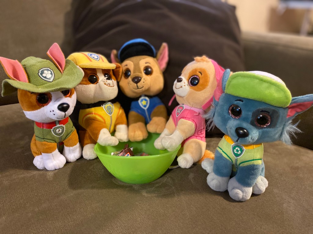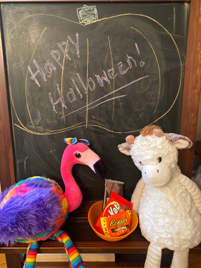 Option #2: Throughout your house set up stuffed animals with bowls of candy. Then have your child/children explore through their house and find them. Say trick or treat and then take on piece of candy out of each bowl.