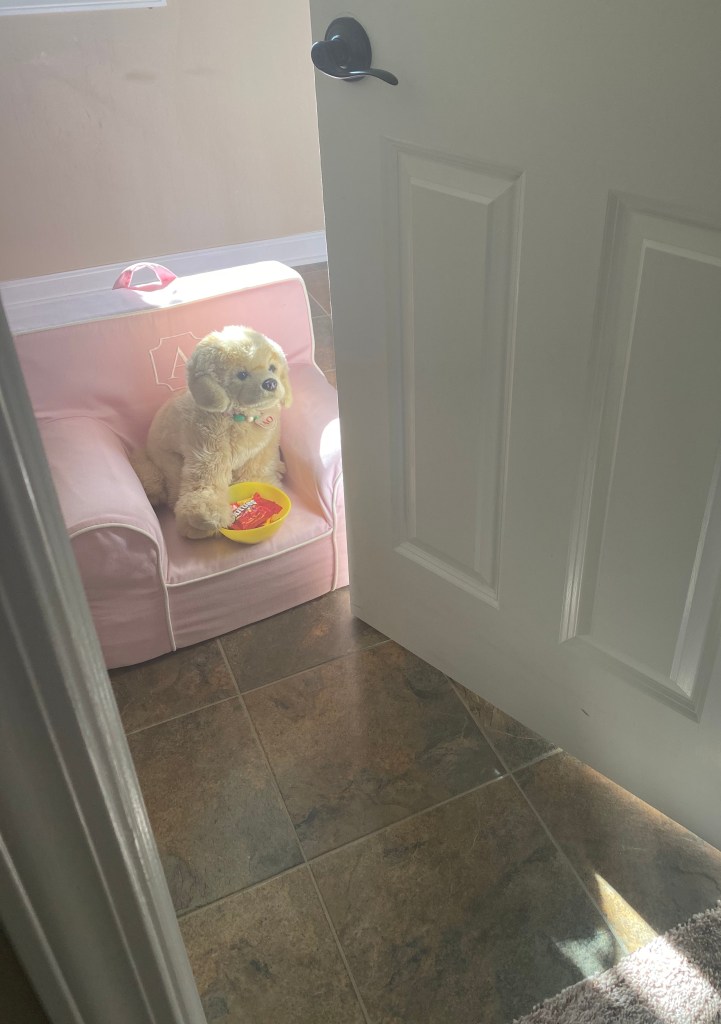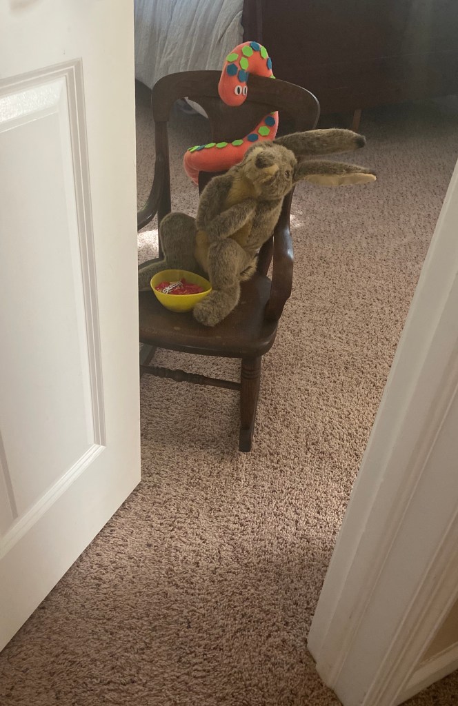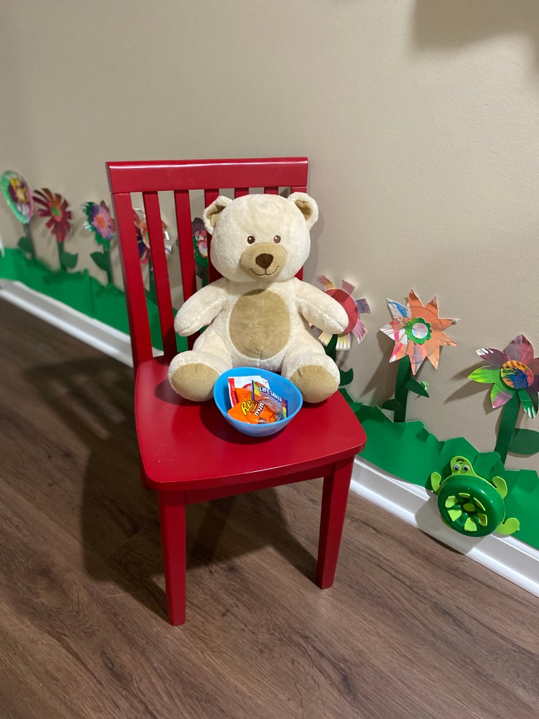 Option #1: Place stuffed animals behind a doors in your house. Have your child/children knock on the door and then the adult opens the door. Child/children then take a piece of candy from the bowl. Repeat at all of the doors in your house. If an adult doesn’t want to be behind the door to open, then child/children can open the door after knocking.