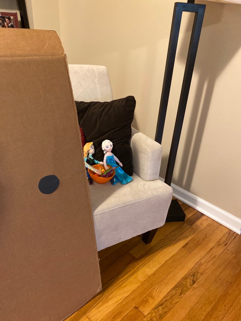 Option #3: If your house has a lot of open space and few doors, or if you want to stay in one part of the house- make a door! We made a door out of cardboard and then moved it after every stop. Once done knocking and the door opens, move the door to the next spot as child/children is getting candy from current spot.