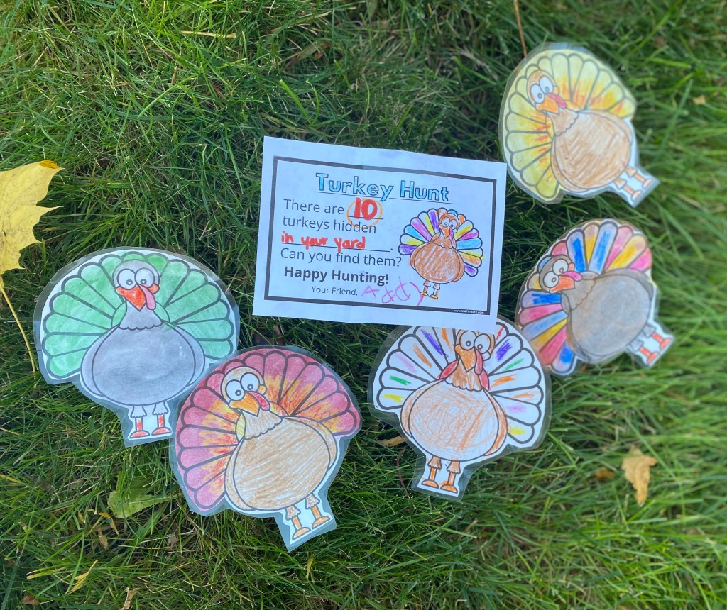 Simple Turkey Hunt: Have child/children color in the turkeys, cut out. Then an adult or sibling/friend hide turkeys in designated area. Find the turkeys. Make more fun? Use a timer! Play several times and try to get the best time.