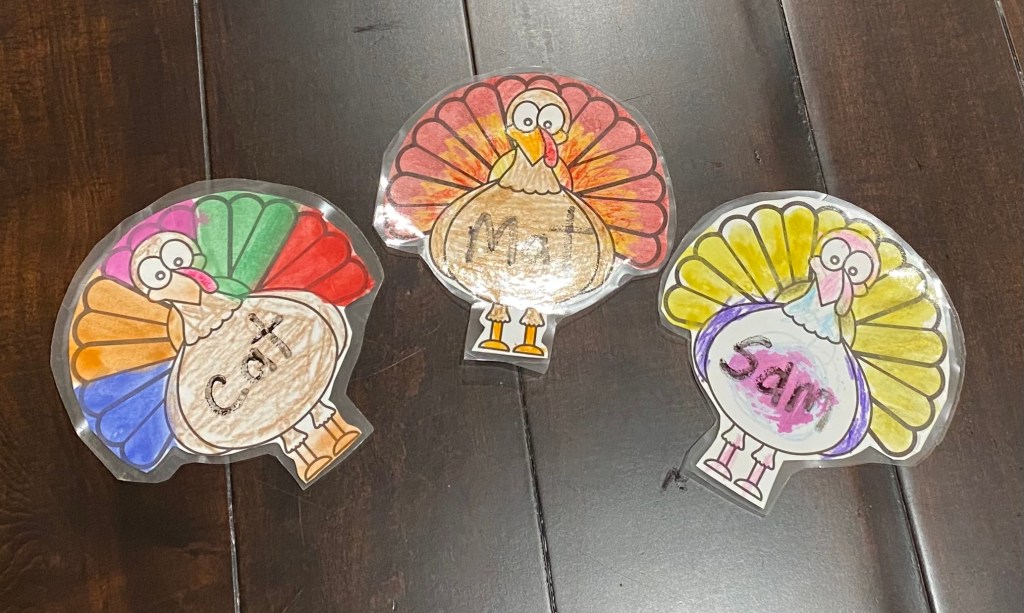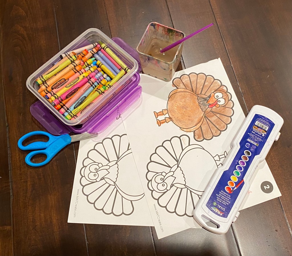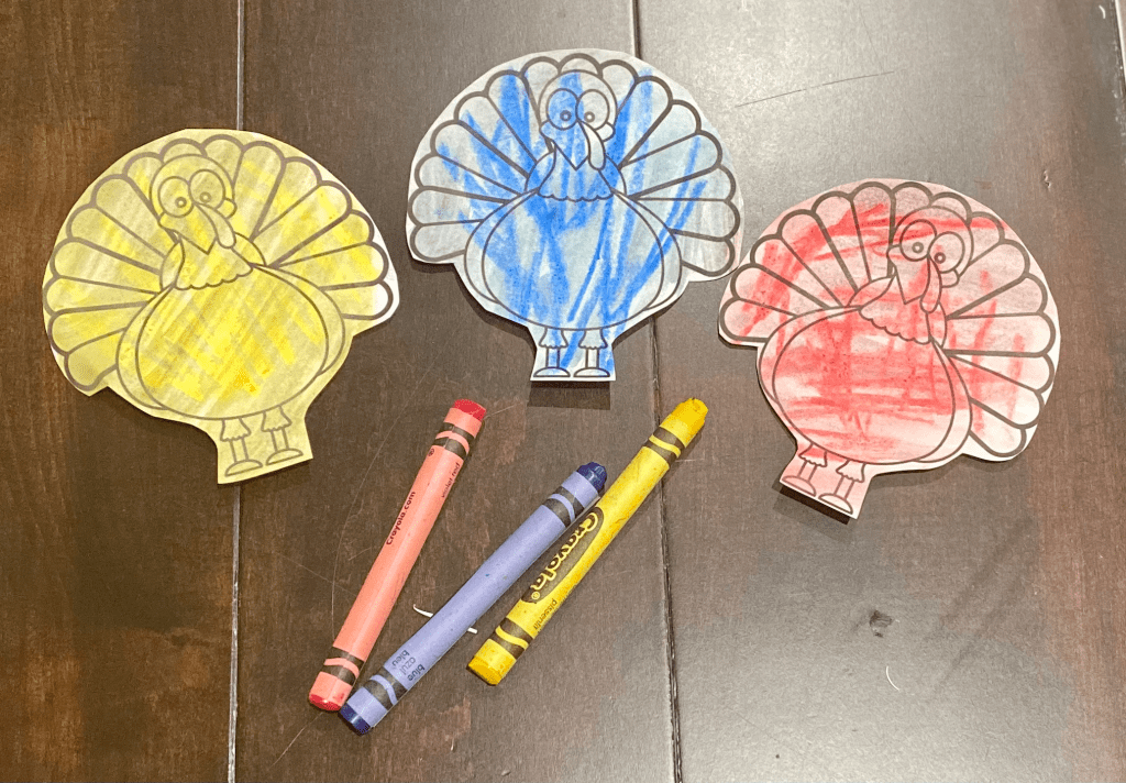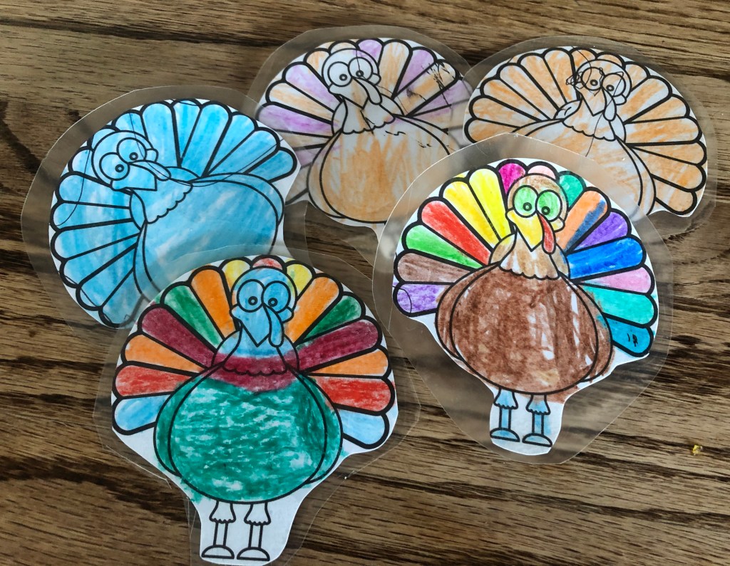 Outside Turkey Hunt: Have a child/children color in the turkeys, cut out. Laminate the turkeys (won’t get ruined by outside elements then). Adult or sibling/friend then hides outside in designated area. Child/children then go find all of the turkeys.