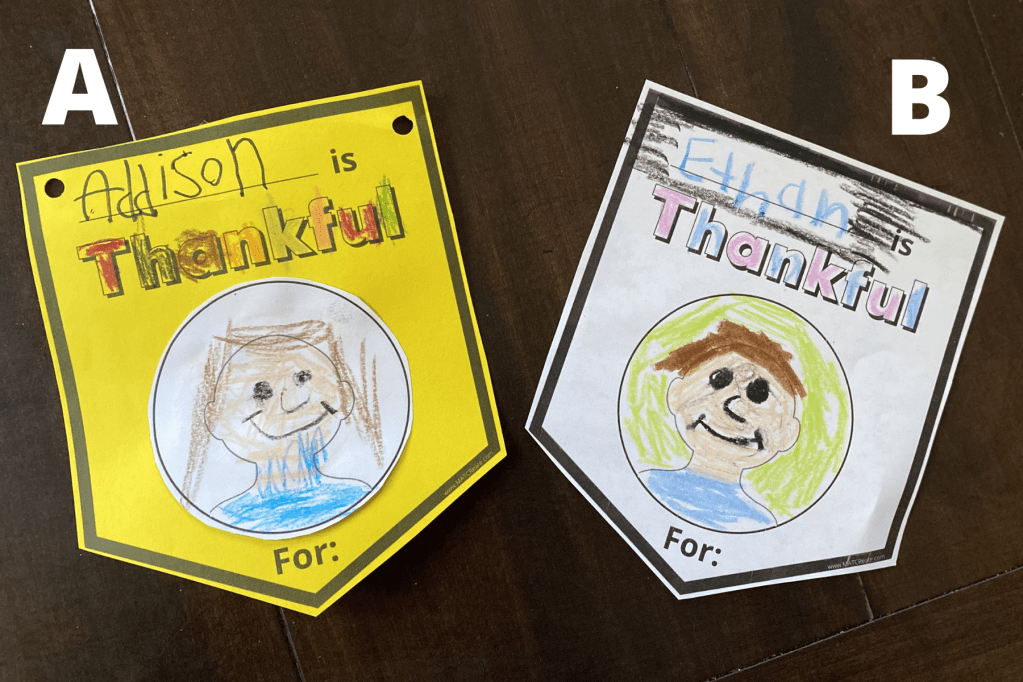 4.) On top of the template, have your child write one thing they are thankful for (or you write it). Then have them draw a picture of it below. Your child can also cut pictures out of magazines, clipart (colored images or black & white, then color in), or use photos. See option below: