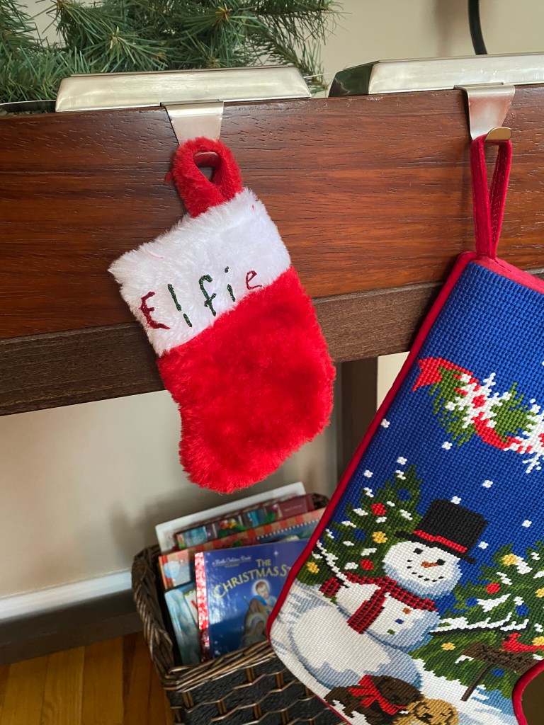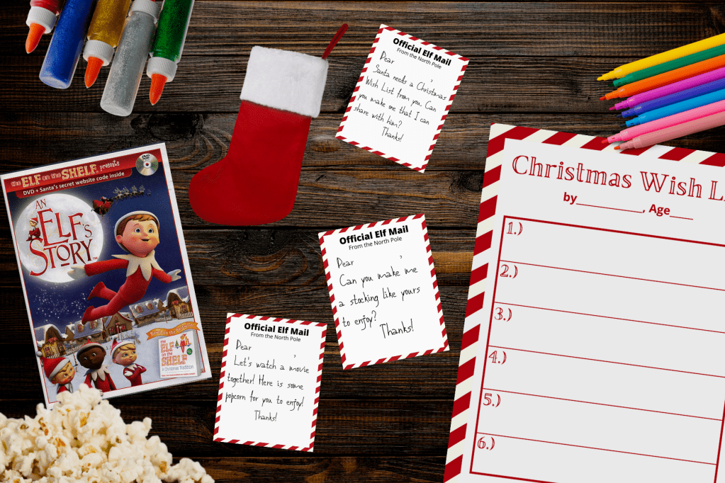 Before our Elf’s arrival, we got ready for him. We made our Christmas list (see below)& watched An Elf Story. After watching the video, we made a little stocking for him, just like the children did in the movie. I bought a mini stocking for a dollar and we wrote his name on it with glitter glue. When our Elf arrived, his stocking was hanging next to our daughters.
