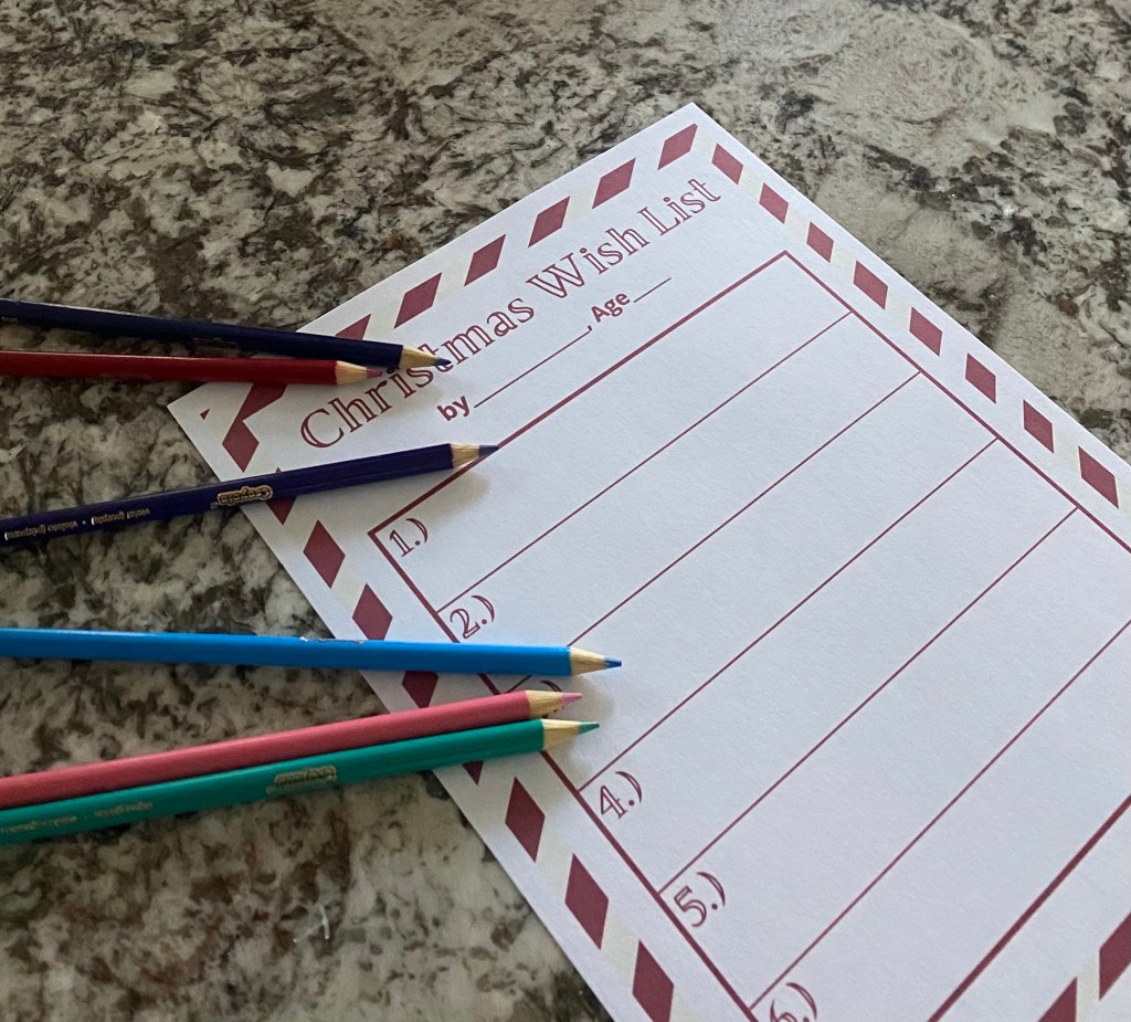 Print out the template. Older children- have them write out what they want. Younger children- have them draw pictures and an adult writes what the pictures are. You could also cut images out of magazines. You can use any materials to make it- markers, colored pencils, crayons. We used colored pencils.