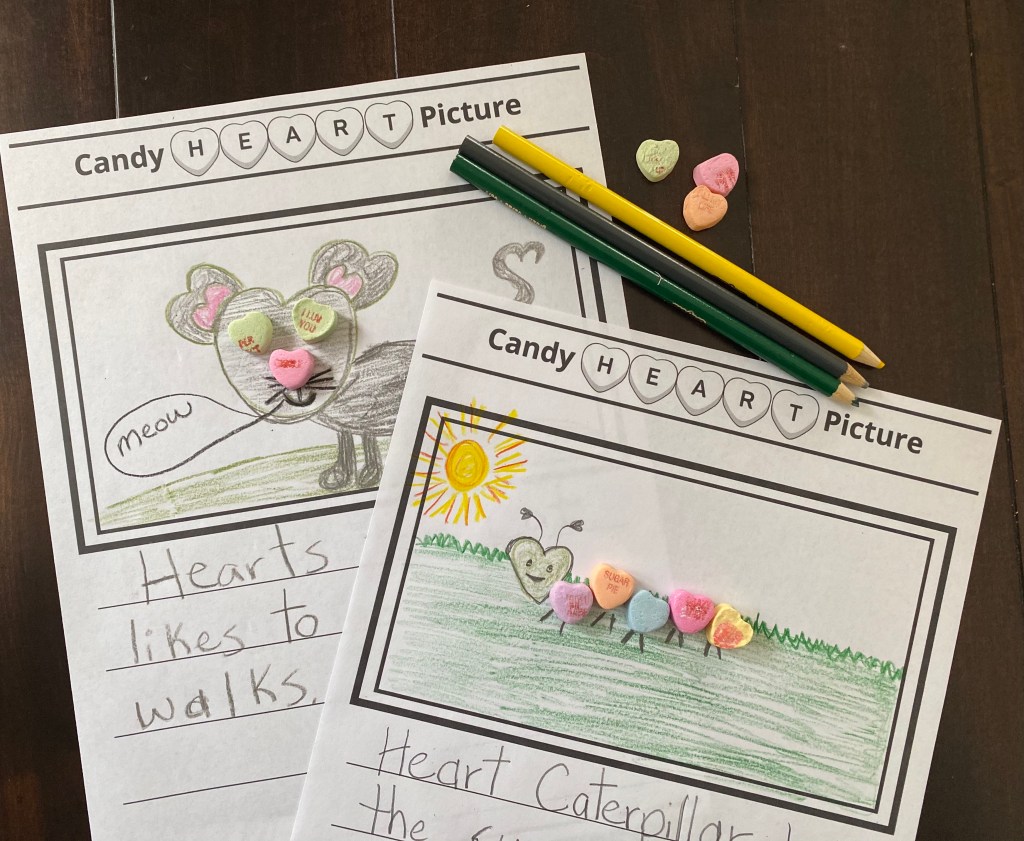 Make a picture that incorporates candy hearts. Then below have your child write a brief story or sentence about the picture they created. If too young to write, write the sentence/story for them.