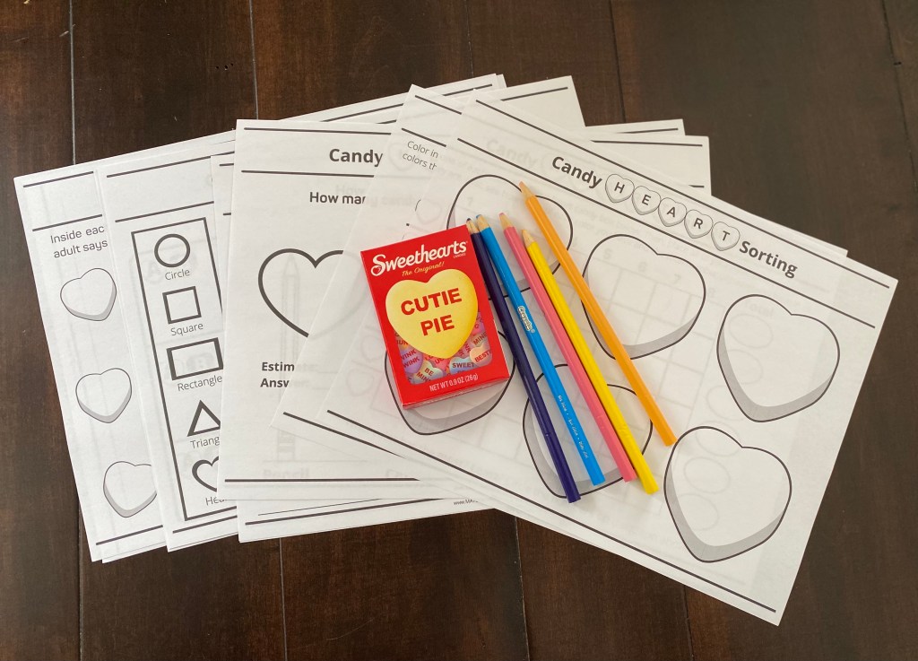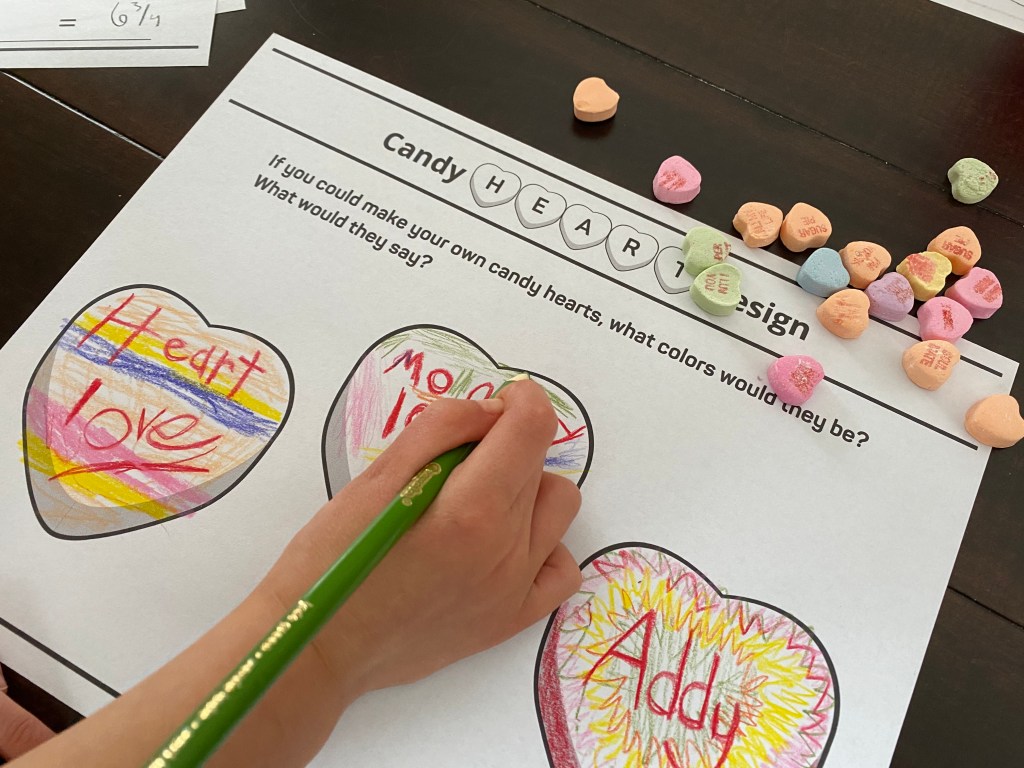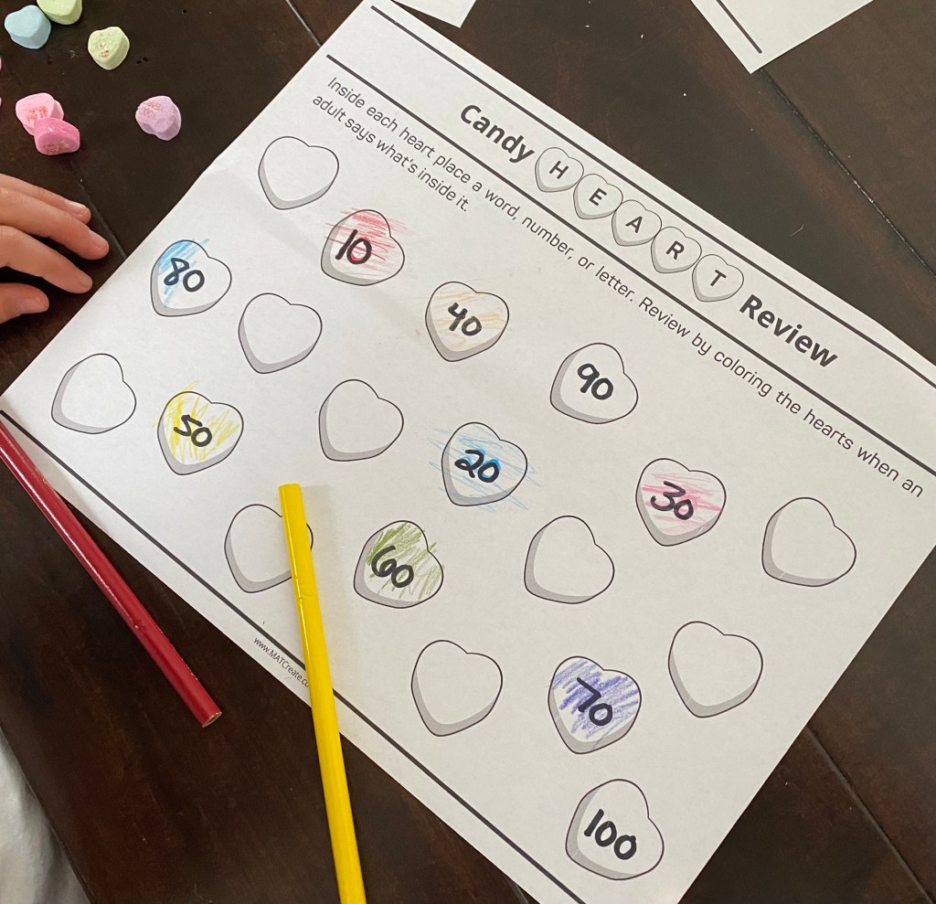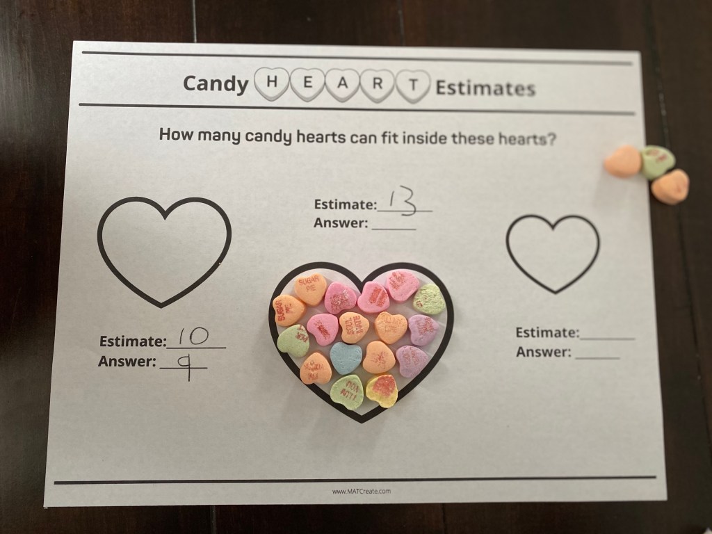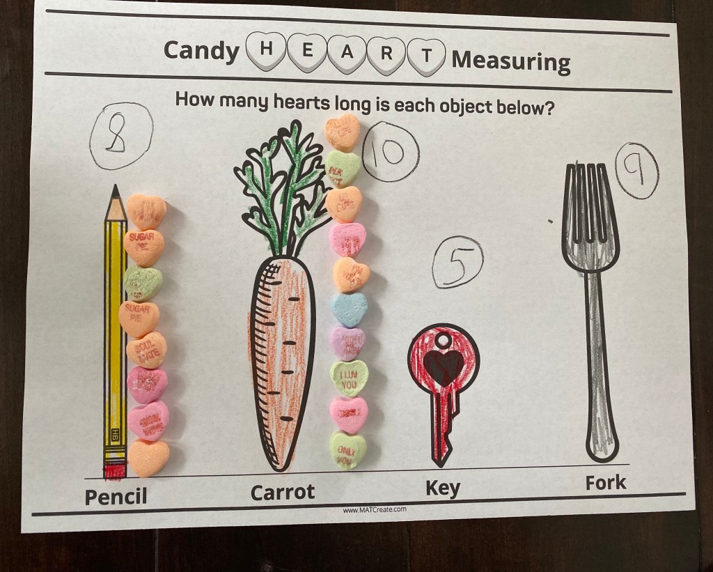 Optional: Find objects in your house and measure how many candy hearts long they are or wide. Make more challenging by having them guess before they do it. Then compare their guess and actual amount it was.
