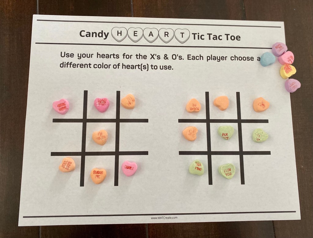 Play Tic Tac Toe! The winner of each game gets to eat one candy heart. Play until you run out of candy hearts.