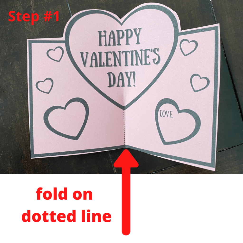 3.) Fold. Fold the the outside (bigger) card on the dotted line. Then fold the heart card (inside card) as shown below. Start by folding the bottom half and then the sides at an angle.