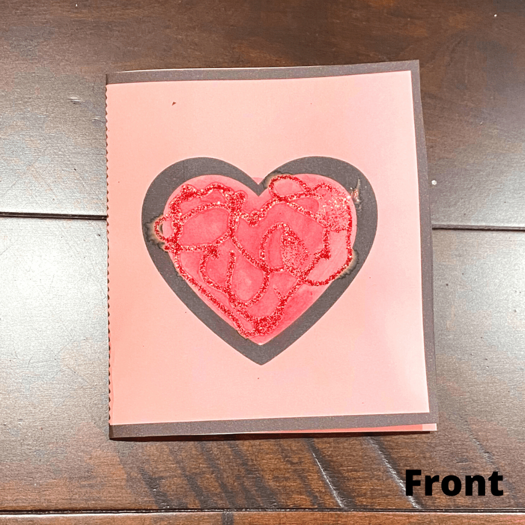 4.) Put together. With glue, double sided tape or a stapler (less messy), attach the heart card inside the larger card.