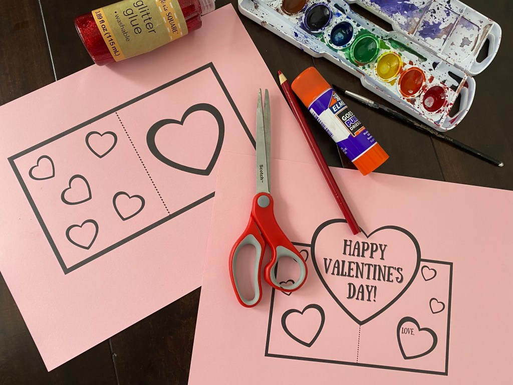 Color options: crayons, watercolors, markers, colored pencils, glitter glue, stickers, foam hearts