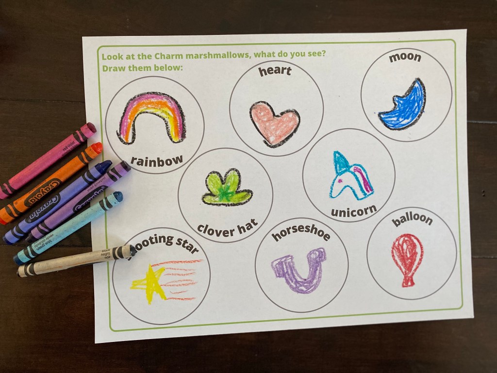After the Leprechaun is complete, challenge your child to include some of the shapes from the marshmallows in their picture. Rainbow? Balloons? Moon? Falling star? Unicorn? Heart? Horseshoe? Hat?