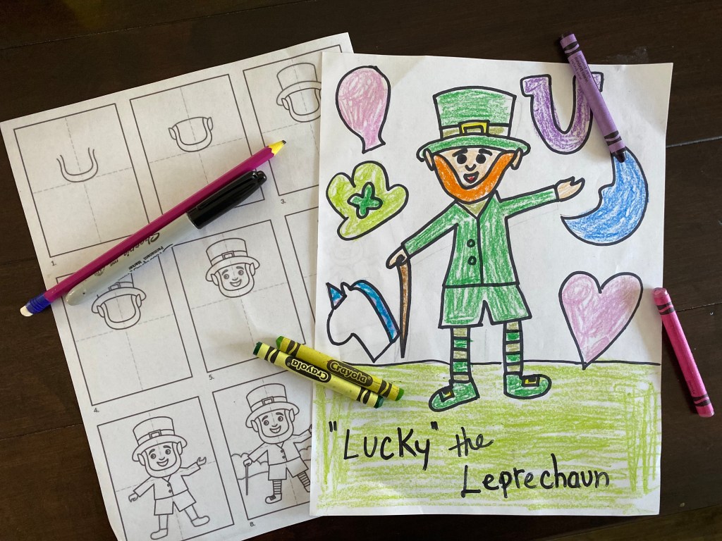 Use this handout to help your child draw a Leprechaun. Or watch a video- basic shape Leprechaun or a more challenging video for older kids here.