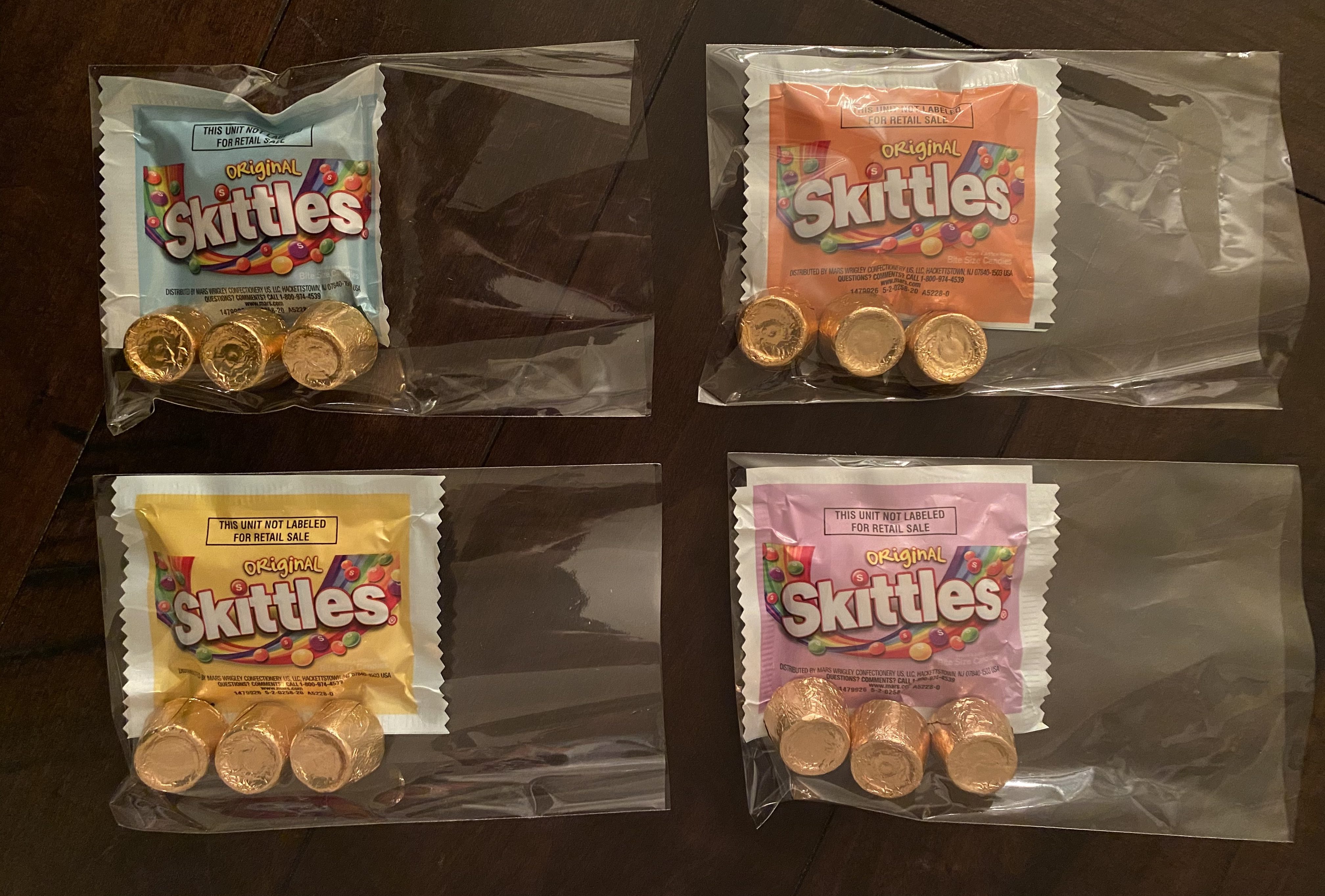 1.) Go shopping- get rolos (gold), mini skittles (rainbow), and clear plastic bags. I used 3 rolos per treat bag and one bag of skittles.