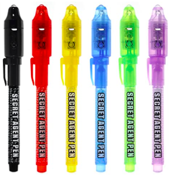 6.) Invisible Ink Pens– My daughter got these at a birthday party and loved them. Pair them with a notepad and let the secret messages begin! Warning- kids also like to draw on themselves and you with them! Great to bring out to dinner to entertain.