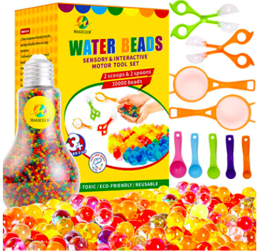 8.) Water Beads: Kids love everything about water beads- shape, texture, fun to watch grow. This kit is even more fun because it comes with special tools to make playing more fun. Bonus- the tools help fine motor development. Add some plastic animals in with the beads and have your child “save” them. They are nontoxic, ready in a few hours, can use for multiple days, and easy to store!