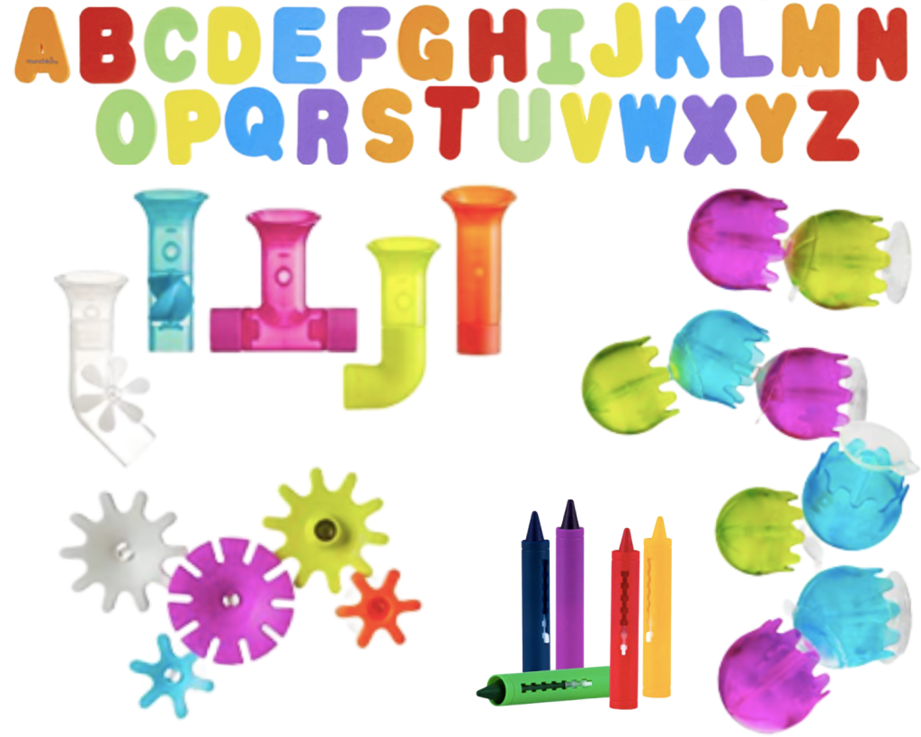 6.) Bath Toys: You can never have enough bath toys. At this age taking baths is a fun & exciting activity. We used these toys in our water table too. Water Gears with Building Bath Pipes, Suction Cup Jellies, Letters and numbers (great for introducing/identifying letters/numbers, then can use for spelling words once older). Bath crayons– let them decorate the tub & then wash away easily.
