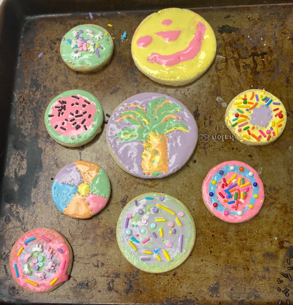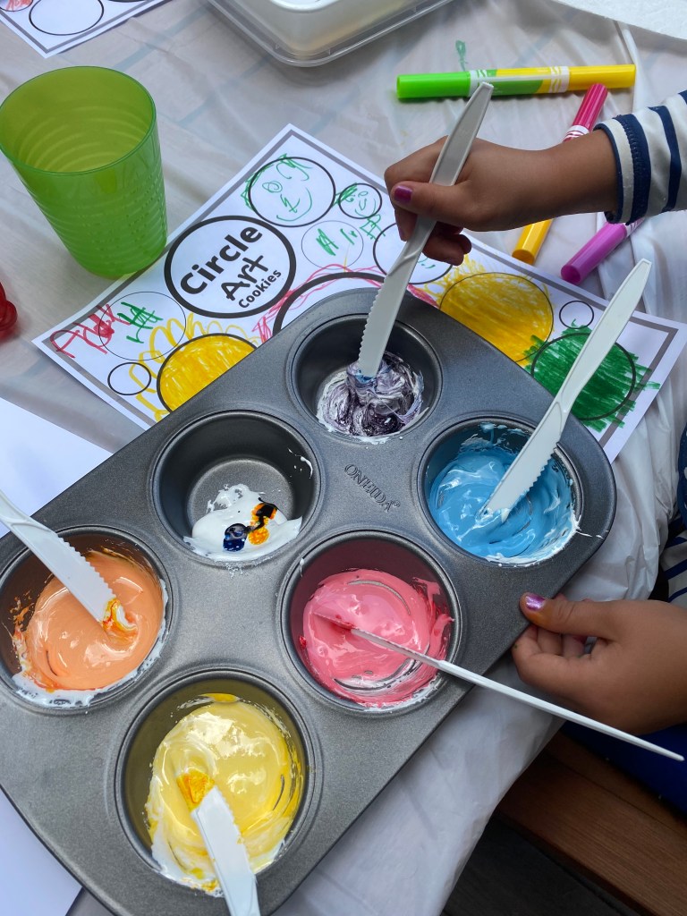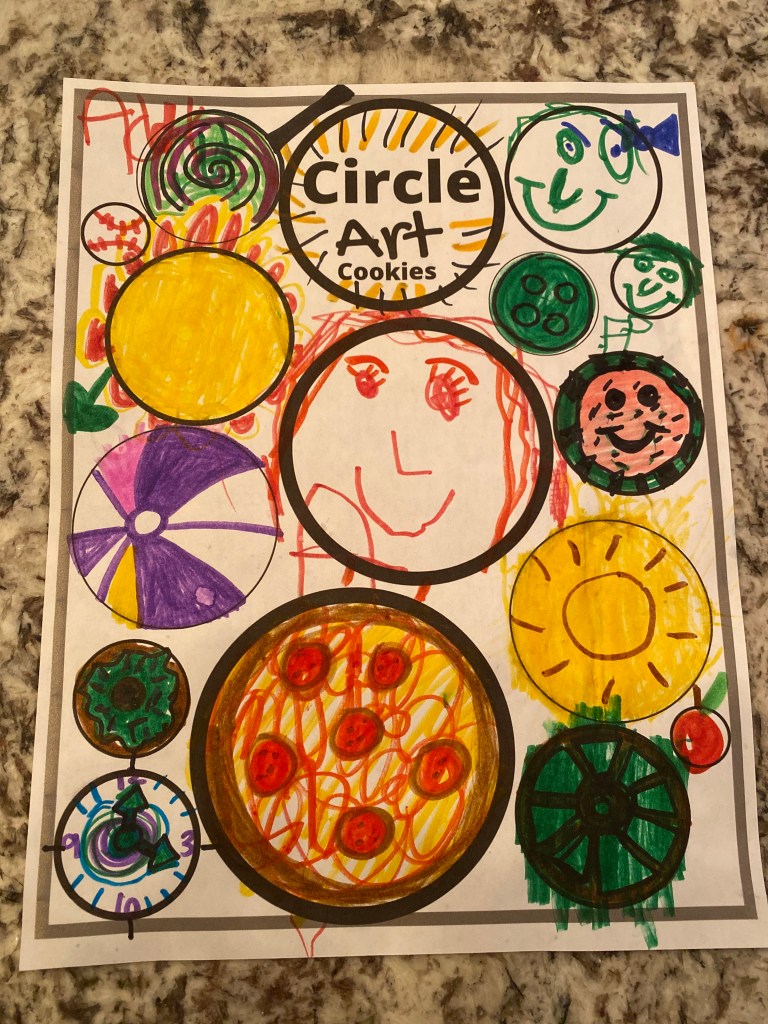 Now the most fun part- Painting/decorating your cookies! Have your children review their circle shape drawings and challenge them to make one of them. Once they each completed at least one cookie from their drawings, they made other designs not on their worksheet.
